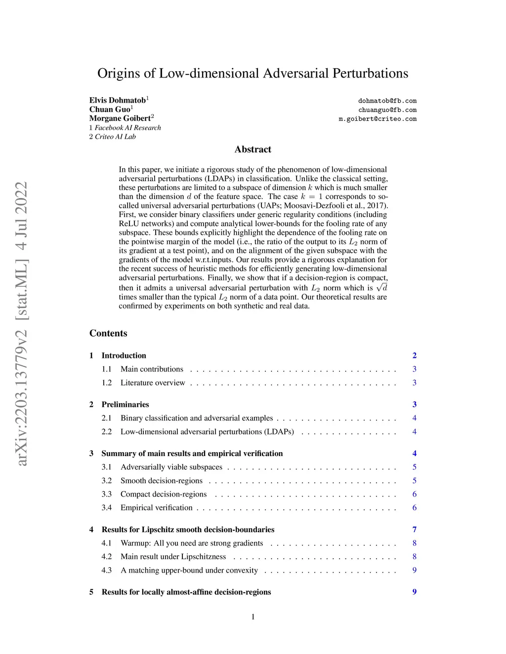 In this paper, we initiate a rigorous study of the phenomenon of low-dimensional adversarial perturbations (LDAPs) in classification. Unlike the classical setting, these perturbations are limited to a subspace of dimension which is much smaller than the dimension of the feature space. The case corresponds to so-called universal adversarial perturbations (UAPs; Moosavi-Dezfooli et al., 2017). First, we consider binary classifiers under generic regularity conditions (including ReLU networks) and compute analytical lower-bounds for the fooling rate of any subspace. These bounds explicitly highlight the dependence of the fooling rate on the pointwise margin of the model (i.e., the ratio of the output to its norm of its gradient at a test point), and on the alignment of the given subspace with the gradients of the model w.r.t. inputs. Our results provide a rigorous explanation for the recent success of heuristic methods for efficiently generating low-dimensional adversarial perturbations. Finally, we show that if a decision-region is compact, then it admits a universal adversarial perturbation with norm which is times smaller than the typical norm of a data point. Our theoretical results are confirmed by experiments on both synthetic and real data.