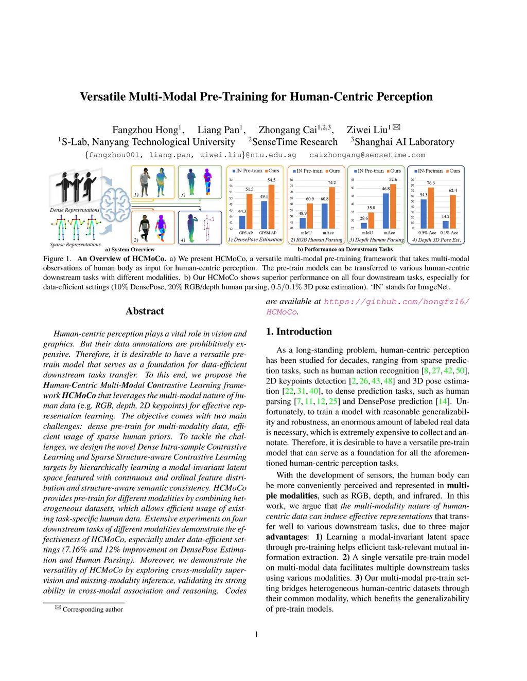 Human-centric perception plays a vital role in vision and graphics. But their data annotations are prohibitively expensive. Therefore, it is desirable to have a versatile pre-train model that serves as a foundation for data-efficient downstream tasks transfer. To this end, we propose the Human-Centric Multi-Modal Contrastive Learning framework HCMoCo that leverages the multi-modal nature of human data (e.g. RGB, depth, 2D keypoints) for effective representation learning. The objective comes with two main challenges: dense pre-train for multi-modality data, efficient usage of sparse human priors. To tackle the challenges, we design the novel Dense Intra-sample Contrastive Learning and Sparse Structure-aware Contrastive Learning targets by hierarchically learning a modal-invariant latent space featured with continuous and ordinal feature distribution and structure-aware semantic consistency. HCMoCo provides pre-train for different modalities by combining heterogeneous datasets, which allows efficient usage of existing task-specific human data. Extensive experiments on four downstream tasks of different modalities demonstrate the effectiveness of HCMoCo, especially under data-efficient settings (7.16% and 12% improvement on DensePose Estimation and Human Parsing). Moreover, we demonstrate the versatility of HCMoCo by exploring cross-modality supervision and missing-modality inference, validating its strong ability in cross-modal association and reasoning.