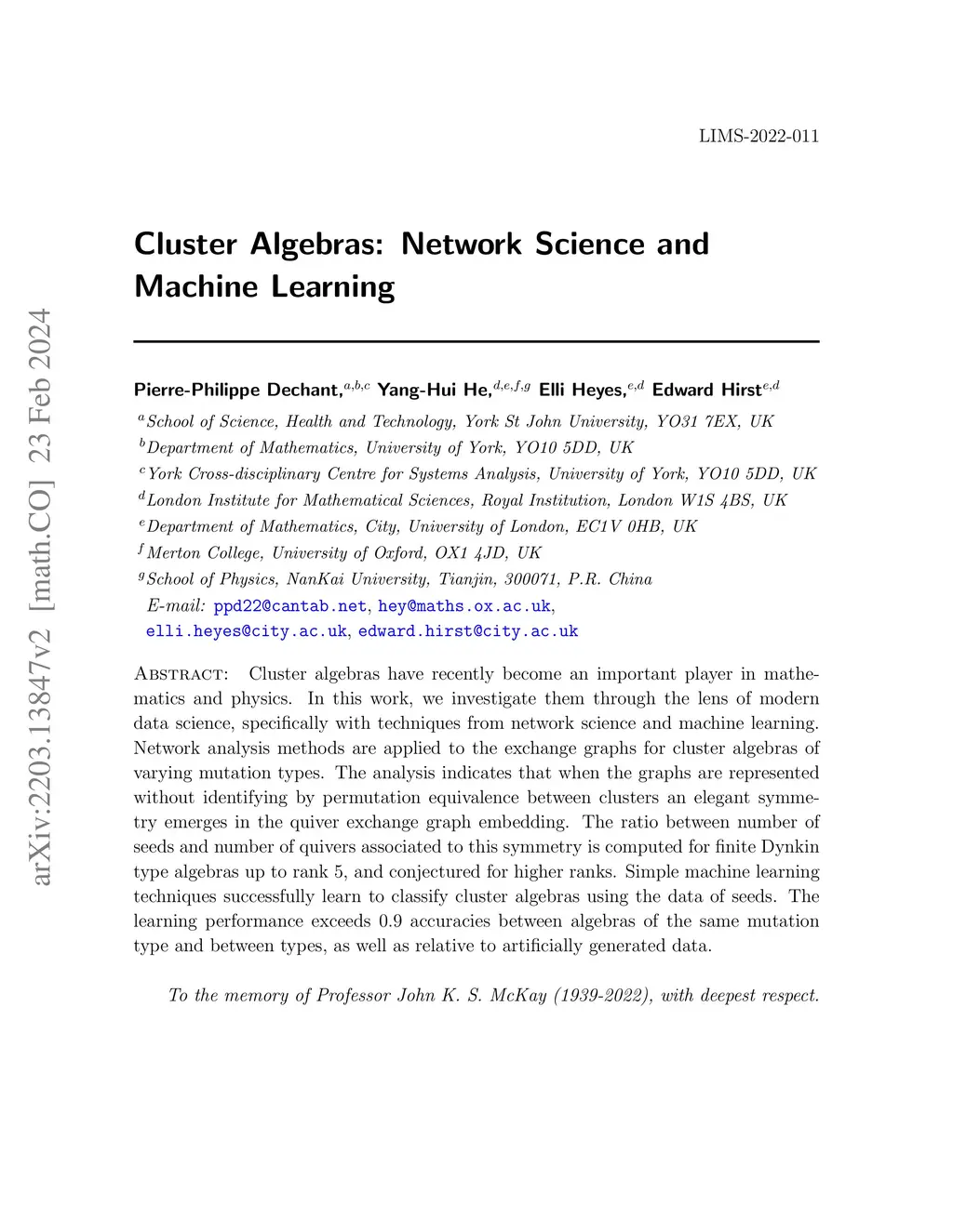 Cluster algebras have recently become an important player in mathematics and physics. In this work, we investigate them through the lens of modern data science, specifically with techniques from network science and machine learning. Network analysis methods are applied to the exchange graphs for cluster algebras of varying mutation types. The analysis indicates that when the graphs are represented without identifying by permutation equivalence between clusters an elegant symmetry emerges in the quiver exchange graph embedding. The ratio between number of seeds and number of quivers associated to this symmetry is computed for finite Dynkin type algebras up to rank 5, and conjectured for higher ranks. Simple machine learning techniques successfully learn to classify cluster algebras using the data of seeds. The learning performance exceeds 0.9 accuracies between algebras of the same mutation type and between types, as well as relative to artificially generated data.
