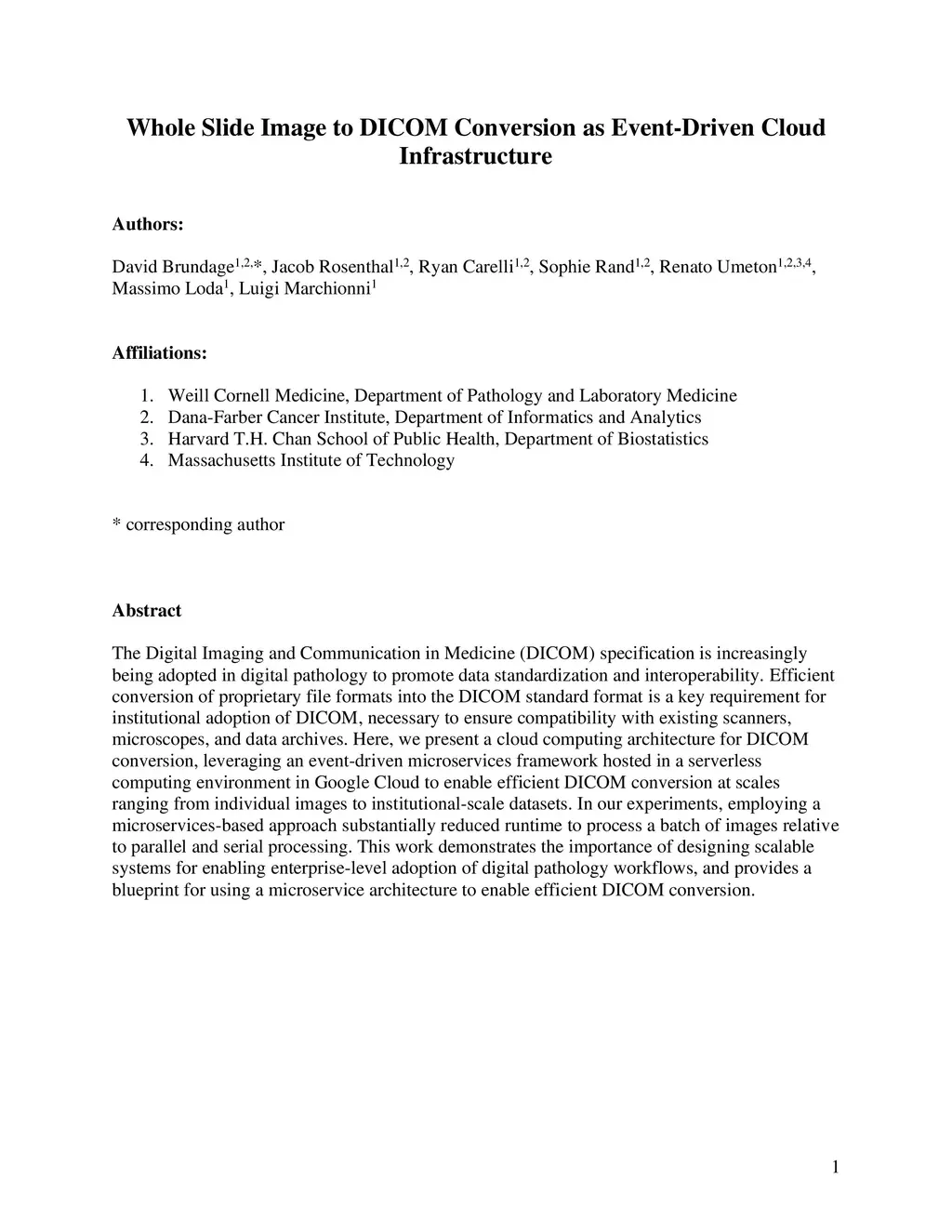 The Digital Imaging and Communication in Medicine (DICOM) specification is increasingly being adopted in digital pathology to promote data standardization and interoperability. Efficient conversion of proprietary file formats into the DICOM standard format is a key requirement for institutional adoption of DICOM, necessary to ensure compatibility with existing scanners, microscopes, and data archives. Here, we present a cloud computing architecture for DICOM conversion, leveraging an event-driven microservices framework hosted in a serverless computing environment in Google Cloud to enable efficient DICOM conversion at scales ranging from individual images to institutional-scale datasets. In our experiments, employing a microservices-based approach substantially reduced runtime to process a batch of images relative to parallel and serial processing. This work demonstrates the importance of designing scalable systems for enabling enterprise-level adoption of digital pathology workflows, and provides a blueprint for using a microservice architecture to enable efficient DICOM conversion.
