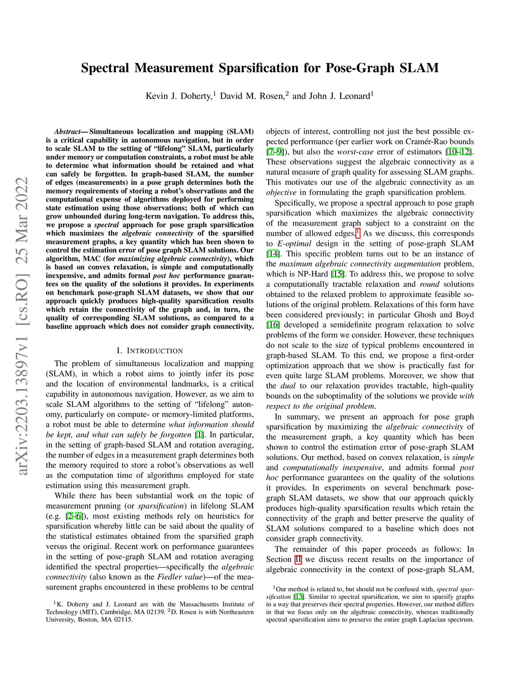 Simultaneous localization and mapping (SLAM) is a critical capability in autonomous navigation, but in order to scale SLAM to the setting of "lifelong" SLAM, particularly under memory or computation constraints, a robot must be able to determine what information should be retained and what can safely be forgotten. In graph-based SLAM, the number of edges (measurements) in a pose graph determines both the memory requirements of storing a robot's observations and the computational expense of algorithms deployed for performing state estimation using those observations; both of which can grow unbounded during long-term navigation. To address this, we propose a spectral approach for pose graph sparsification which maximizes the algebraic connectivity of the sparsified measurement graphs, a key quantity which has been shown to control the estimation error of pose graph SLAM solutions. Our algorithm, MAC (for "maximizing algebraic connectivity"), which is based on convex relaxation, is simple and computationally inexpensive, and admits formal post hoc performance guarantees on the quality of the solutions it provides. In experiments on benchmark pose-graph SLAM datasets, we show that our approach quickly produces high-quality sparsification results which retain the connectivity of the graph and, in turn, the quality of corresponding SLAM solutions, as compared to a baseline approach which does not consider graph connectivity.