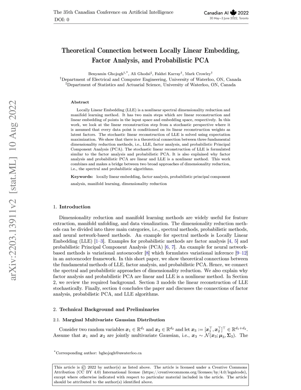 Locally Linear Embedding (LLE) is a nonlinear spectral dimensionality reduction and manifold learning method. It has two main steps which are linear reconstruction and linear embedding of points in the input space and embedding space, respectively. In this work, we look at the linear reconstruction step from a stochastic perspective where it is assumed that every data point is conditioned on its linear reconstruction weights as latent factors. The stochastic linear reconstruction of LLE is solved using expectation maximization. We show that there is a theoretical connection between three fundamental dimensionality reduction methods, i.e., LLE, factor analysis, and probabilistic Principal Component Analysis (PCA). The stochastic linear reconstruction of LLE is formulated similar to the factor analysis and probabilistic PCA. It is also explained why factor analysis and probabilistic PCA are linear and LLE is a nonlinear method. This work combines and makes a bridge between two broad approaches of dimensionality reduction, i.e., the spectral and probabilistic algorithms.