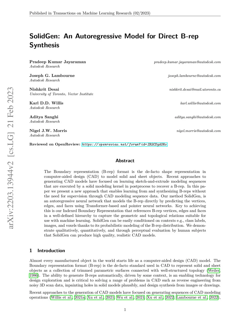 The Boundary representation (B-rep) format is the de-facto shape representation in computer-aided design (CAD) to model solid and sheet objects. Recent approaches to generating CAD models have focused on learning sketch-and-extrude modeling sequences that are executed by a solid modeling kernel in postprocess to recover a B-rep. In this paper we present a new approach that enables learning from and synthesizing B-reps without the need for supervision through CAD modeling sequence data. Our method SolidGen, is an autoregressive neural network that models the B-rep directly by predicting the vertices, edges, and faces using Transformer-based and pointer neural networks. Key to achieving this is our Indexed Boundary Representation that references B-rep vertices, edges and faces in a well-defined hierarchy to capture the geometric and topological relations suitable for use with machine learning. SolidGen can be easily conditioned on contexts e.g., class labels, images, and voxels thanks to its probabilistic modeling of the B-rep distribution. We demonstrate qualitatively, quantitatively, and through perceptual evaluation by human subjects that SolidGen can produce high quality, realistic CAD models.