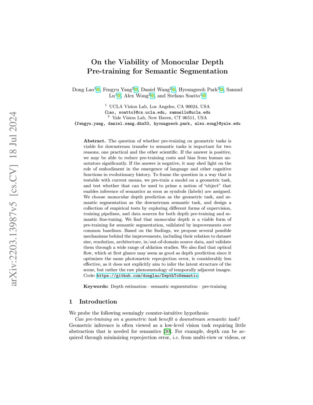 The question of whether pre-training on geometric tasks is viable for downstream transfer to semantic tasks is important for two reasons, one practical and the other scientific. If the answer is positive, we may be able to reduce pre-training cost and bias from human annotators significantly. If the answer is negative, it may shed light on the role of embodiment in the emergence of language and other cognitive functions in evolutionary history. To frame the question in a way that is testable with current means, we pre-train a model on a geometric task, and test whether that can be used to prime a notion of óbject' that enables inference of semantics as soon as symbols (labels) are assigned. We choose monocular depth prediction as the geometric task, and semantic segmentation as the downstream semantic task, and design a collection of empirical tests by exploring different forms of supervision, training pipelines, and data sources for both depth pre-training and semantic fine-tuning. We find that monocular depth is a viable form of pre-training for semantic segmentation, validated by improvements over common baselines. Based on the findings, we propose several possible mechanisms behind the improvements, including their relation to dataset size, resolution, architecture, in/out-of-domain source data, and validate them through a wide range of ablation studies. We also find that optical flow, which at first glance may seem as good as depth prediction since it optimizes the same photometric reprojection error, is considerably less effective, as it does not explicitly aim to infer the latent structure of the scene, but rather the raw phenomenology of temporally adjacent images.