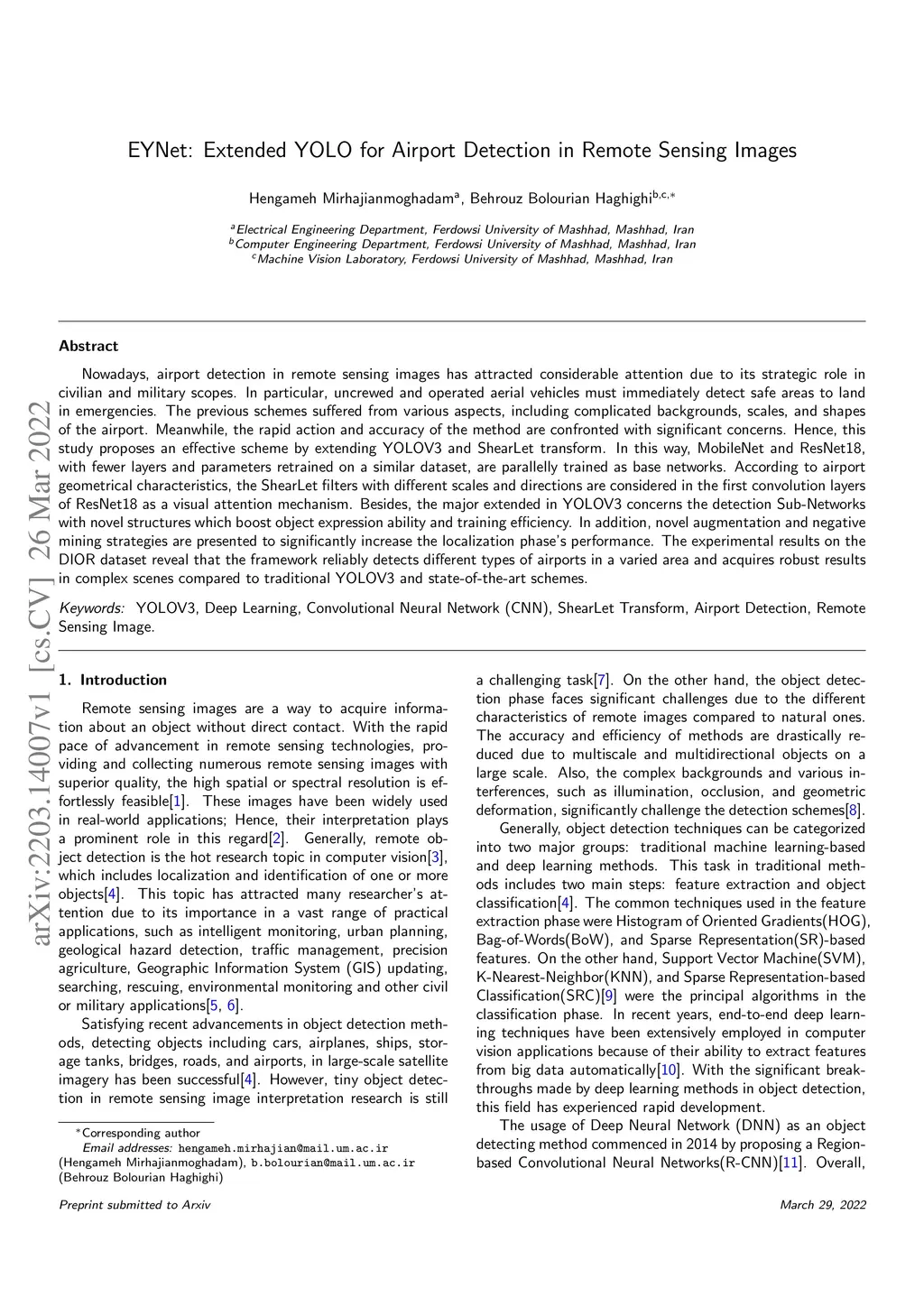 Nowadays, airport detection in remote sensing images has attracted considerable attention due to its strategic role in civilian and military scopes. In particular, uncrewed and operated aerial vehicles must immediately detect safe areas to land in emergencies. The previous schemes suffered from various aspects, including complicated backgrounds, scales, and shapes of the airport. Meanwhile, the rapid action and accuracy of the method are confronted with significant concerns. Hence, this study proposes an effective scheme by extending YOLOV3 and ShearLet transform. In this way, MobileNet and ResNet18, with fewer layers and parameters retrained on a similar dataset, are parallelly trained as base networks. According to airport geometrical characteristics, the ShearLet filters with different scales and directions are considered in the first convolution layers of ResNet18 as a visual attention mechanism. Besides, the major extended in YOLOV3 concerns the detection Sub-Networks with novel structures which boost object expression ability and training efficiency. In addition, novel augmentation and negative mining strategies are presented to significantly increase the localization phase's performance. The experimental results on the DIOR dataset reveal that the framework reliably detects different types of airports in a varied area and acquires robust results in complex scenes compared to traditional YOLOV3 and state-of-the-art schemes.