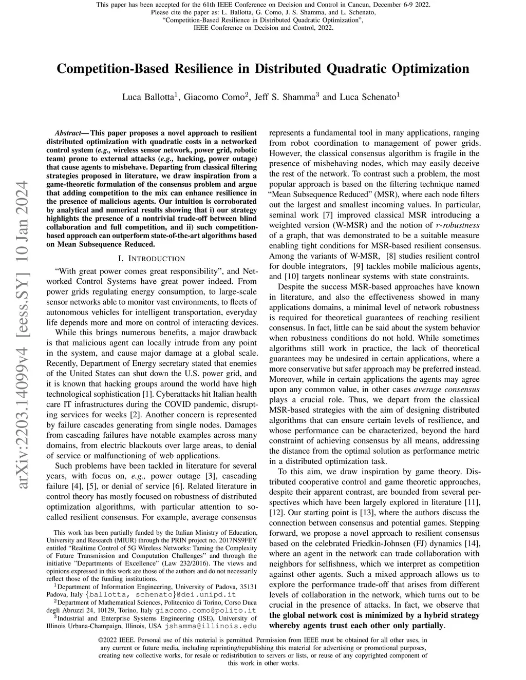 This paper proposes a novel approach to resilient distributed optimization with quadratic costs in a networked control system (e.g., wireless sensor network, power grid, robotic team) prone to external attacks (e.g., hacking, power outage) that cause agents to misbehave. Departing from classical filtering strategies proposed in literature, we draw inspiration from a game-theoretic formulation of the consensus problem and argue that adding competition to the mix can enhance resilience in the presence of malicious agents. Our intuition is corroborated by analytical and numerical results showing that i) our strategy highlights the presence of a nontrivial tradeoff between blind collaboration and full competition, and ii) such competition-based approach can outperform state-of-the-art algorithms based on Mean Subsequence Reduced.