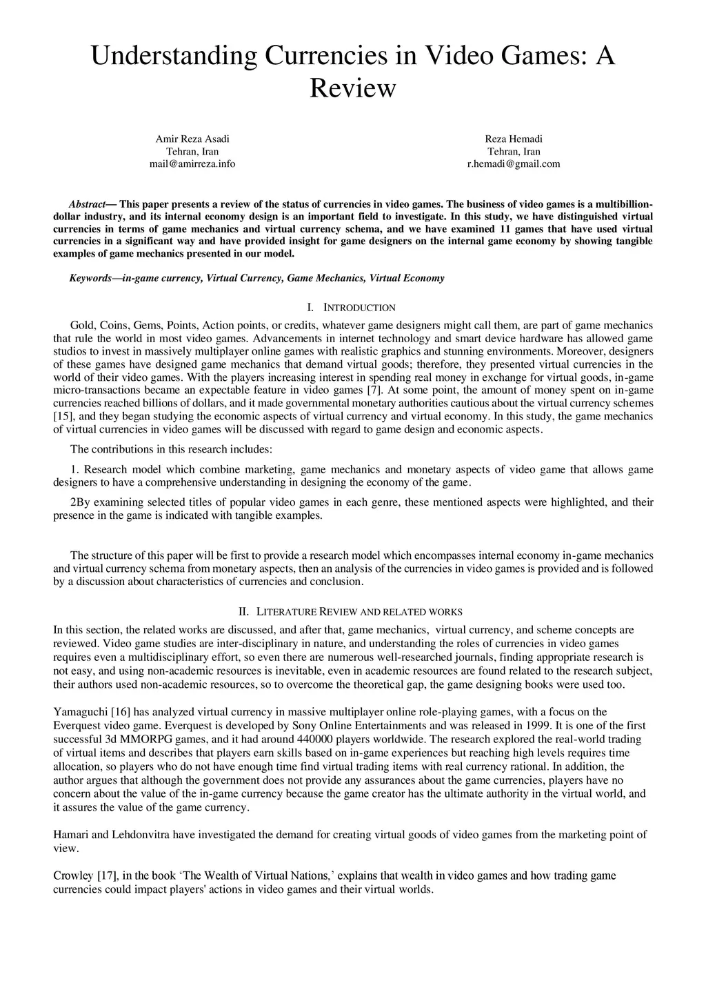 This paper presents a review of the status of currencies in video games. The business of video games is a multibillion-dollar industry, and its internal economy design is an important field to investigate. In this study, we have distinguished virtual currencies in terms of game mechanics and virtual currency schema, and we have examined 11 games that have used virtual currencies in a significant way and have provided insight for game designers on the internal game economy by showing tangible examples of game mechanics presented in our model