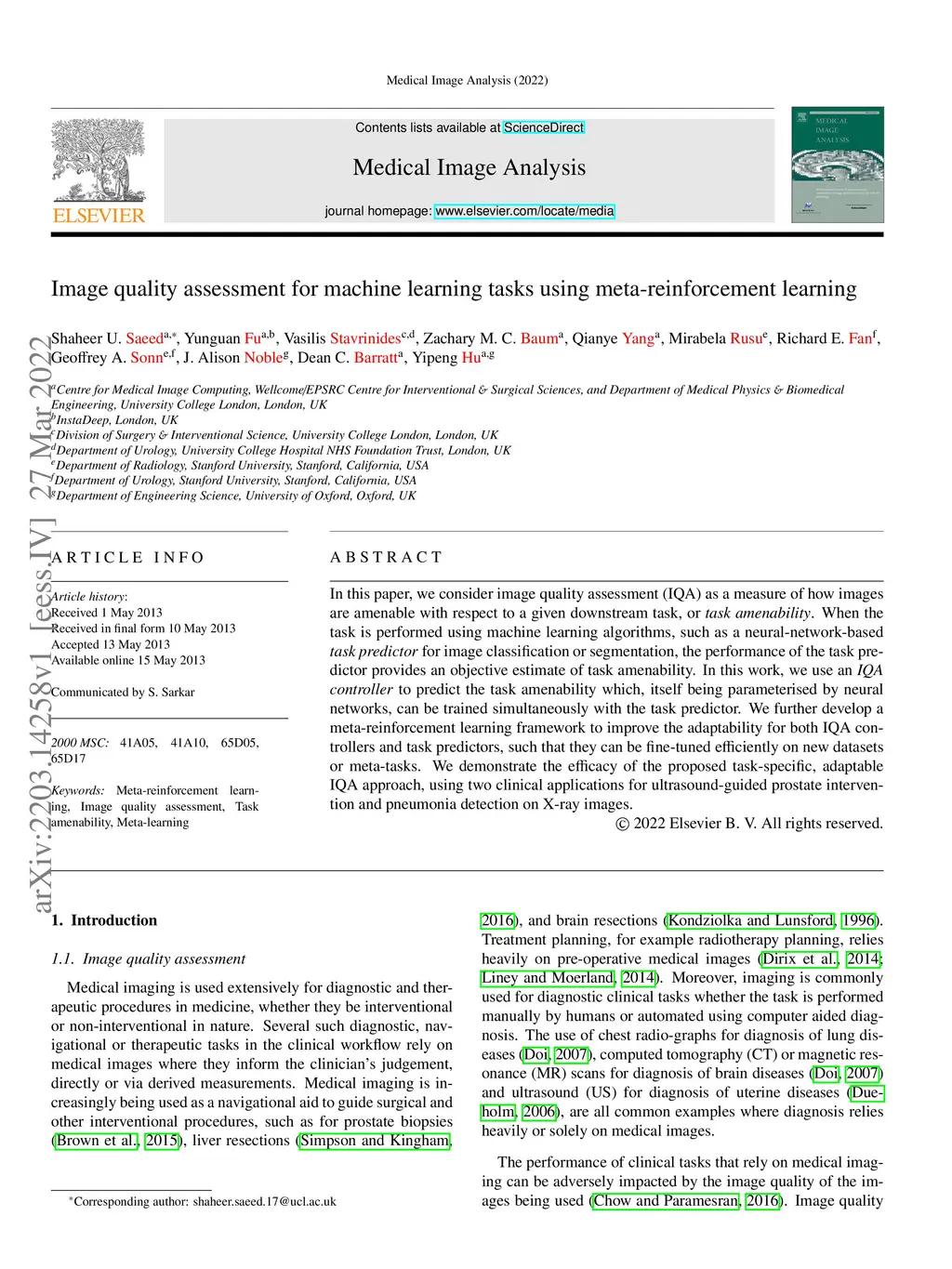 In this paper, we consider image quality assessment (IQA) as a measure of how images are amenable with respect to a given downstream task, or task amenability. When the task is performed using machine learning algorithms, such as a neural-network-based task predictor for image classification or segmentation, the performance of the task predictor provides an objective estimate of task amenability. In this work, we use an IQA controller to predict the task amenability which, itself being parameterised by neural networks, can be trained simultaneously with the task predictor. We further develop a meta-reinforcement learning framework to improve the adaptability for both IQA controllers and task predictors, such that they can be fine-tuned efficiently on new datasets or meta-tasks. We demonstrate the efficacy of the proposed task-specific, adaptable IQA approach, using two clinical applications for ultrasound-guided prostate intervention and pneumonia detection on X-ray images.