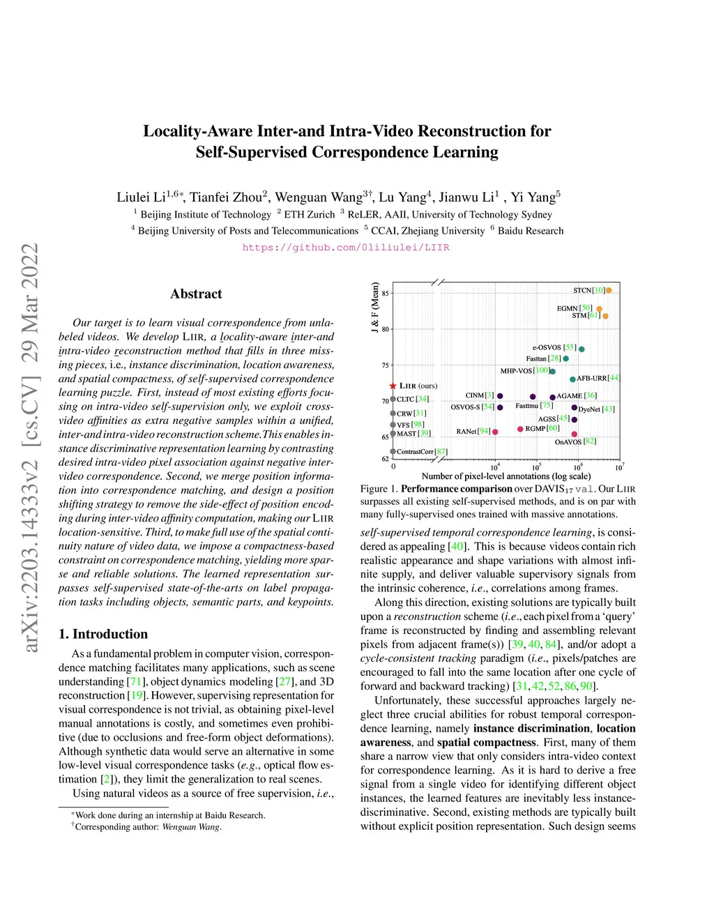 Our target is to learn visual correspondence from unlabeled videos. We develop LIIR, a locality-aware inter-and intra-video reconstruction framework that fills in three missing pieces, i.e., instance discrimination, location awareness, and spatial compactness, of self-supervised correspondence learning puzzle. First, instead of most existing efforts focusing on intra-video self-supervision only, we exploit cross video affinities as extra negative samples within a unified, inter-and intra-video reconstruction scheme. This enables instance discriminative representation learning by contrasting desired intra-video pixel association against negative inter-video correspondence. Second, we merge position information into correspondence matching, and design a position shifting strategy to remove the side-effect of position encoding during inter-video affinity computation, making our LIIR location-sensitive. Third, to make full use of the spatial continuity nature of video data, we impose a compactness-based constraint on correspondence matching, yielding more sparse and reliable solutions. The learned representation surpasses self-supervised state-of-the-arts on label propagation tasks including objects, semantic parts, and keypoints.