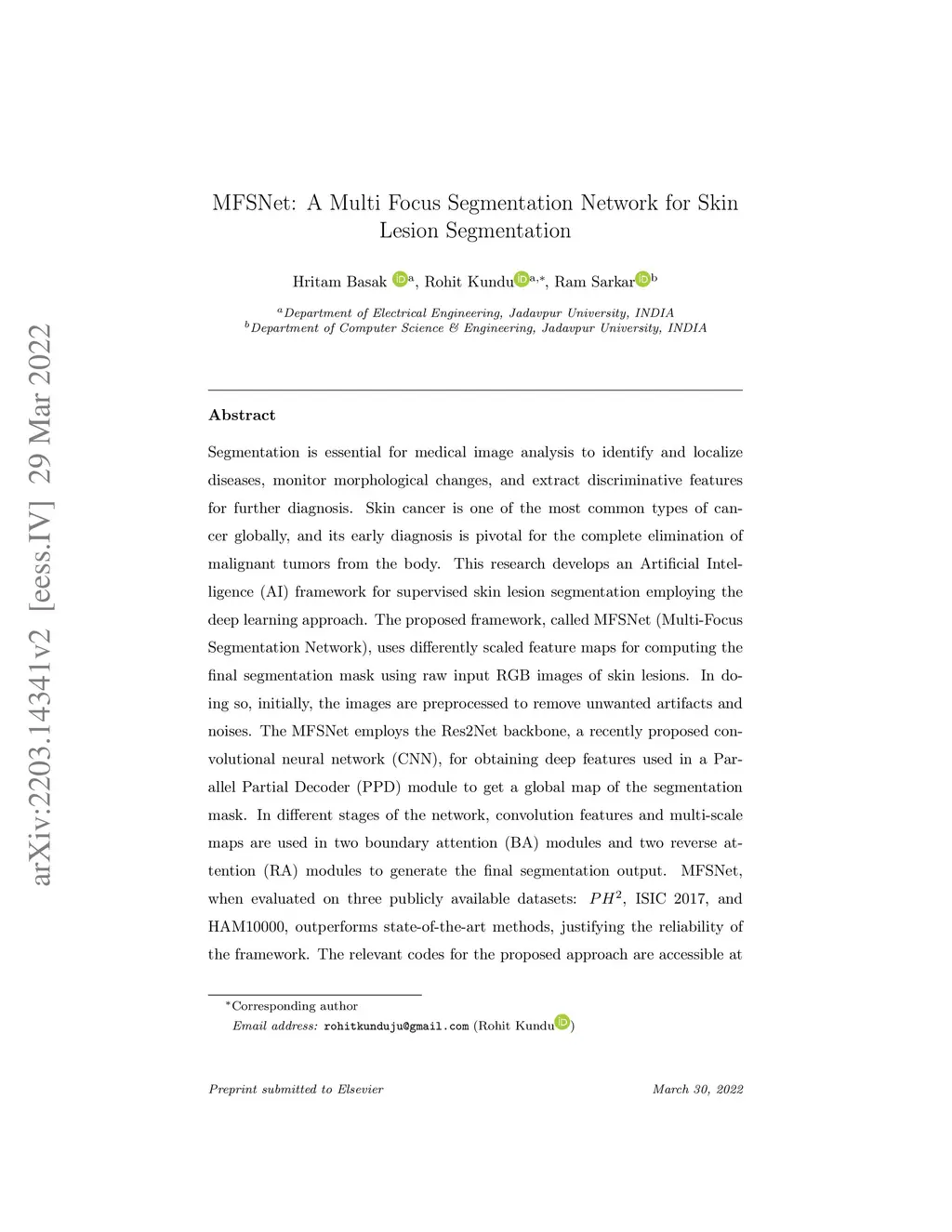 Segmentation is essential for medical image analysis to identify and localize diseases, monitor morphological changes, and extract discriminative features for further diagnosis. Skin cancer is one of the most common types of cancer globally, and its early diagnosis is pivotal for the complete elimination of malignant tumors from the body. This research develops an Artificial Intelligence (AI) framework for supervised skin lesion segmentation employing the deep learning approach. The proposed framework, called MFSNet (Multi-Focus Segmentation Network), uses differently scaled feature maps for computing the final segmentation mask using raw input RGB images of skin lesions. In doing so, initially, the images are preprocessed to remove unwanted artifacts and noises. The MFSNet employs the Res2Net backbone, a recently proposed convolutional neural network (CNN), for obtaining deep features used in a Parallel Partial Decoder (PPD) module to get a global map of the segmentation mask. In different stages of the network, convolution features and multi-scale maps are used in two boundary attention (BA) modules and two reverse attention (RA) modules to generate the final segmentation output. MFSNet, when evaluated on three publicly available datasets: , ISIC 2017, and HAM10000, outperforms state-of-the-art methods, justifying the reliability of the framework. The relevant codes for the proposed approach are accessible at https://github.com/Rohit-Kundu/MFSNet