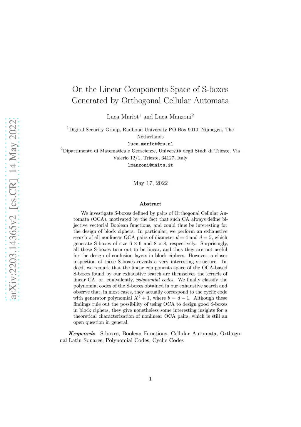 We investigate S-boxes defined by pairs of Orthogonal Cellular Automata (OCA), motivated by the fact that such CA always define bijective vectorial Boolean functions, and could thus be interesting for the design of block ciphers. In particular, we perform an exhaustive search of all nonlinear OCA pairs of diameter and , which generate S-boxes of size and , respectively. Surprisingly, all these S-boxes turn out to be linear, and thus they are not useful for the design of confusion layers in block ciphers. However, a closer inspection of these S-boxes reveals a very interesting structure. Indeed, we remark that the linear components space of the OCA-based S-boxes found by our exhaustive search are themselves the kernels of linear CA, or, equivalently, \emph{polynomial codes}. We finally classify the polynomial codes of the S-boxes obtained in our exhaustive search and observe that, in most cases, they actually correspond to the cyclic code with generator polynomial , where . Although these findings rule out the possibility of using OCA to design good S-boxes in block ciphers, they give nonetheless some interesting insights for a theoretical characterization of nonlinear OCA pairs, which is still an open question in general.