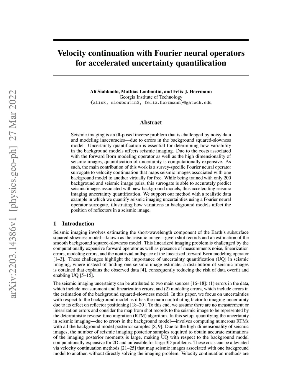 Seismic imaging is an ill-posed inverse problem that is challenged by noisy data and modeling inaccuracies -- due to errors in the background squared-slowness model. Uncertainty quantification is essential for determining how variability in the background models affects seismic imaging. Due to the costs associated with the forward Born modeling operator as well as the high dimensionality of seismic images, quantification of uncertainty is computationally expensive. As such, the main contribution of this work is a survey-specific Fourier neural operator surrogate to velocity continuation that maps seismic images associated with one background model to another virtually for free. While being trained with only 200 background and seismic image pairs, this surrogate is able to accurately predict seismic images associated with new background models, thus accelerating seismic imaging uncertainty quantification. We support our method with a realistic data example in which we quantify seismic imaging uncertainties using a Fourier neural operator surrogate, illustrating how variations in background models affect the position of reflectors in a seismic image.