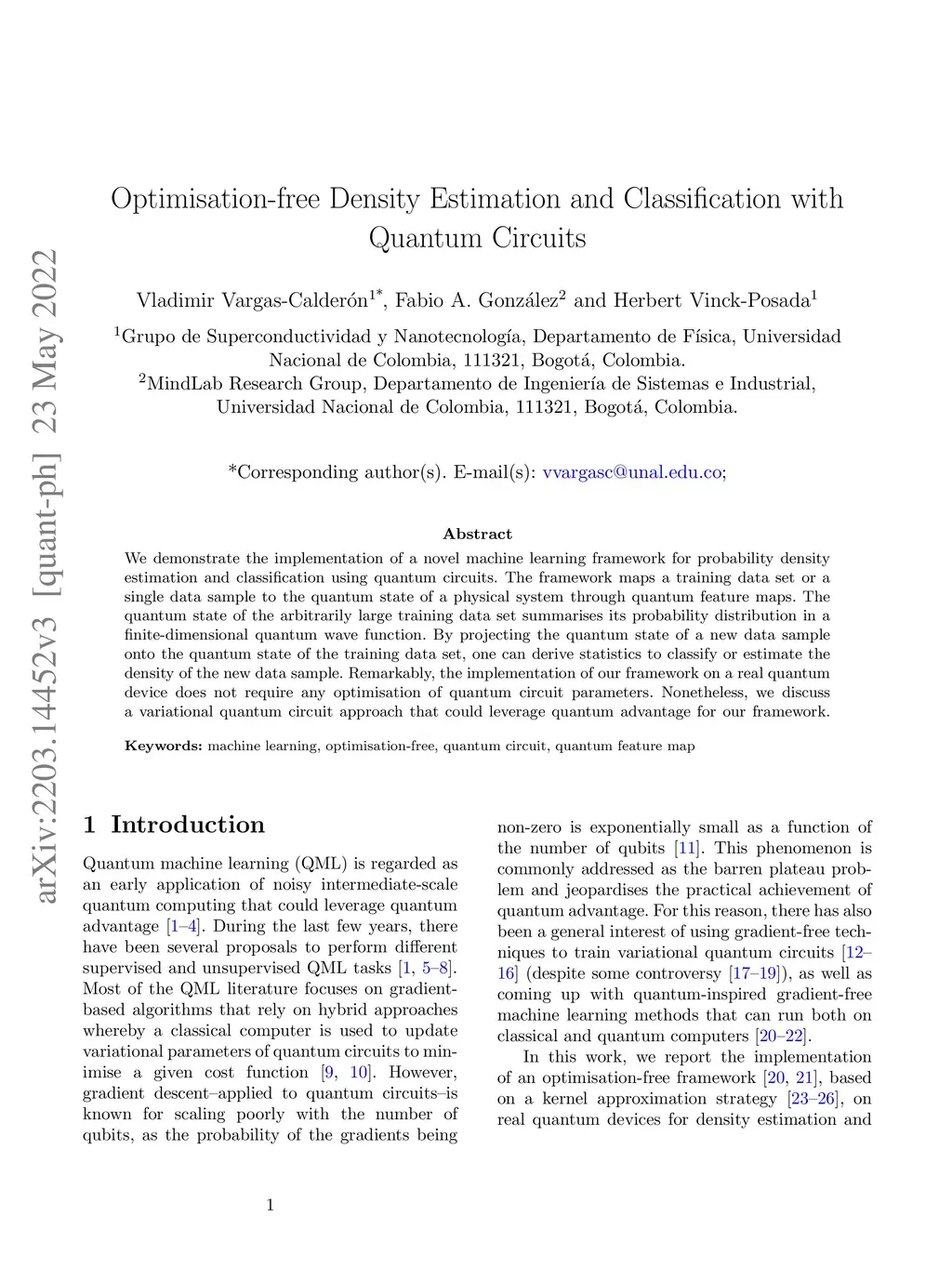 We demonstrate the implementation of a novel machine learning framework for probability density estimation and classification using quantum circuits. The framework maps a training data set or a single data sample to the quantum state of a physical system through quantum feature maps. The quantum state of the arbitrarily large training data set summarises its probability distribution in a finite-dimensional quantum wave function. By projecting the quantum state of a new data sample onto the quantum state of the training data set, one can derive statistics to classify or estimate the density of the new data sample. Remarkably, the implementation of our framework on a real quantum device does not require any optimisation of quantum circuit parameters. Nonetheless, we discuss a variational quantum circuit approach that could leverage quantum advantage for our framework.