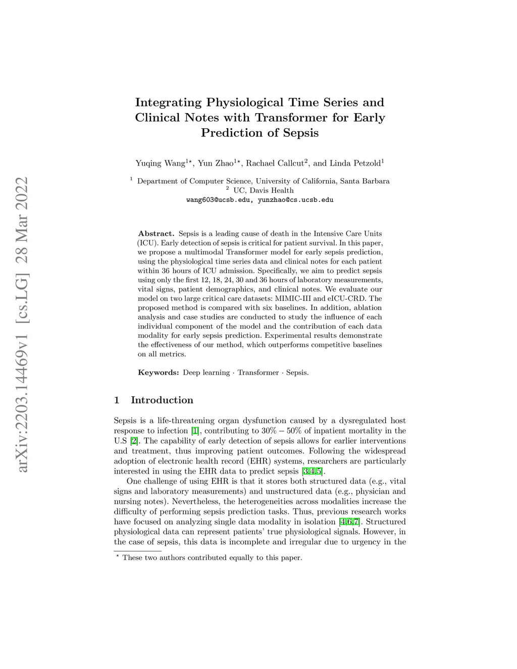Sepsis is a leading cause of death in the Intensive Care Units (ICU). Early detection of sepsis is critical for patient survival. In this paper, we propose a multimodal Transformer model for early sepsis prediction, using the physiological time series data and clinical notes for each patient within hours of ICU admission. Specifically, we aim to predict sepsis using only the first 12, 18, 24, 30 and 36 hours of laboratory measurements, vital signs, patient demographics, and clinical notes. We evaluate our model on two large critical care datasets: MIMIC-III and eICU-CRD. The proposed method is compared with six baselines. In addition, ablation analysis and case studies are conducted to study the influence of each individual component of the model and the contribution of each data modality for early sepsis prediction. Experimental results demonstrate the effectiveness of our method, which outperforms competitive baselines on all metrics.