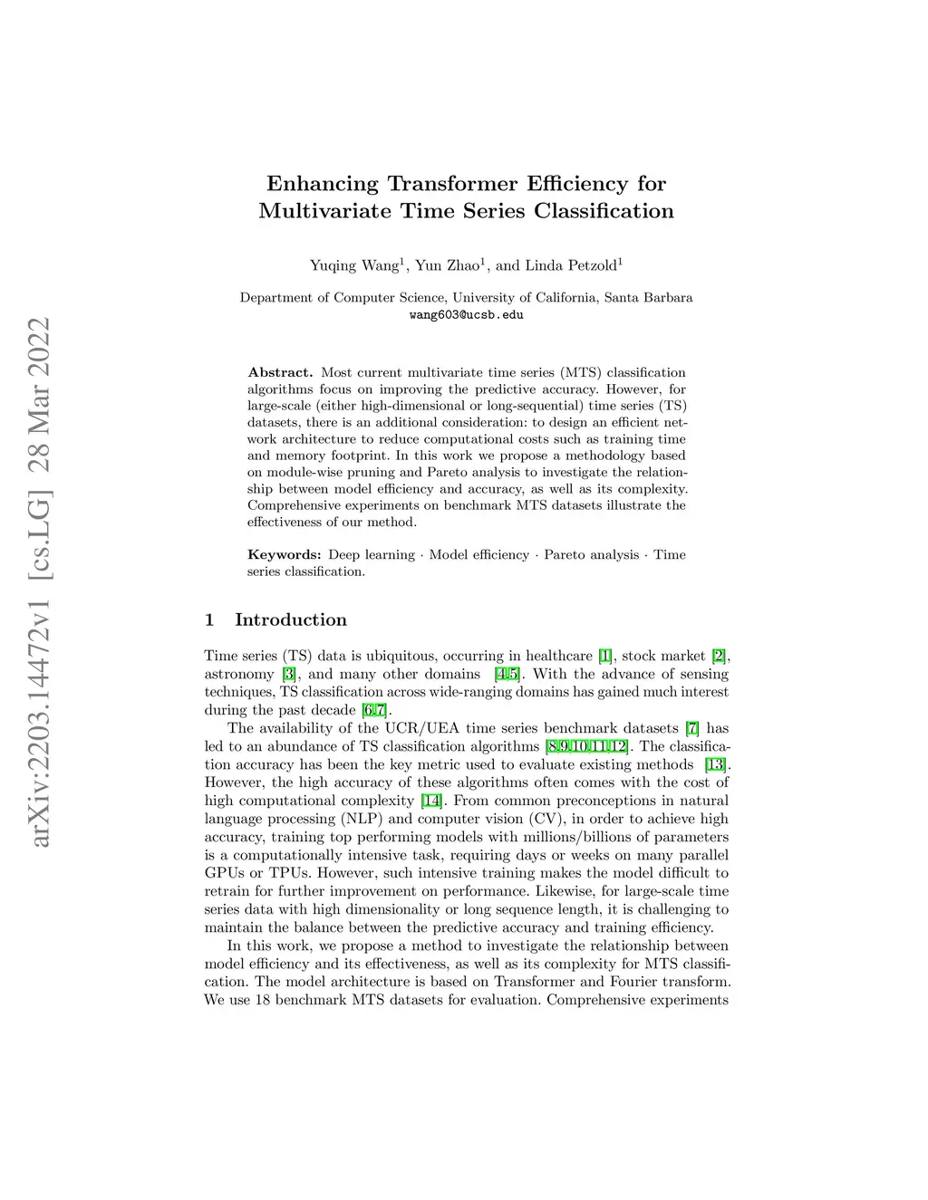Most current multivariate time series (MTS) classification algorithms focus on improving the predictive accuracy. However, for large-scale (either high-dimensional or long-sequential) time series (TS) datasets, there is an additional consideration: to design an efficient network architecture to reduce computational costs such as training time and memory footprint. In this work we propose a methodology based on module-wise pruning and Pareto analysis to investigate the relationship between model efficiency and accuracy, as well as its complexity. Comprehensive experiments on benchmark MTS datasets illustrate the effectiveness of our method.