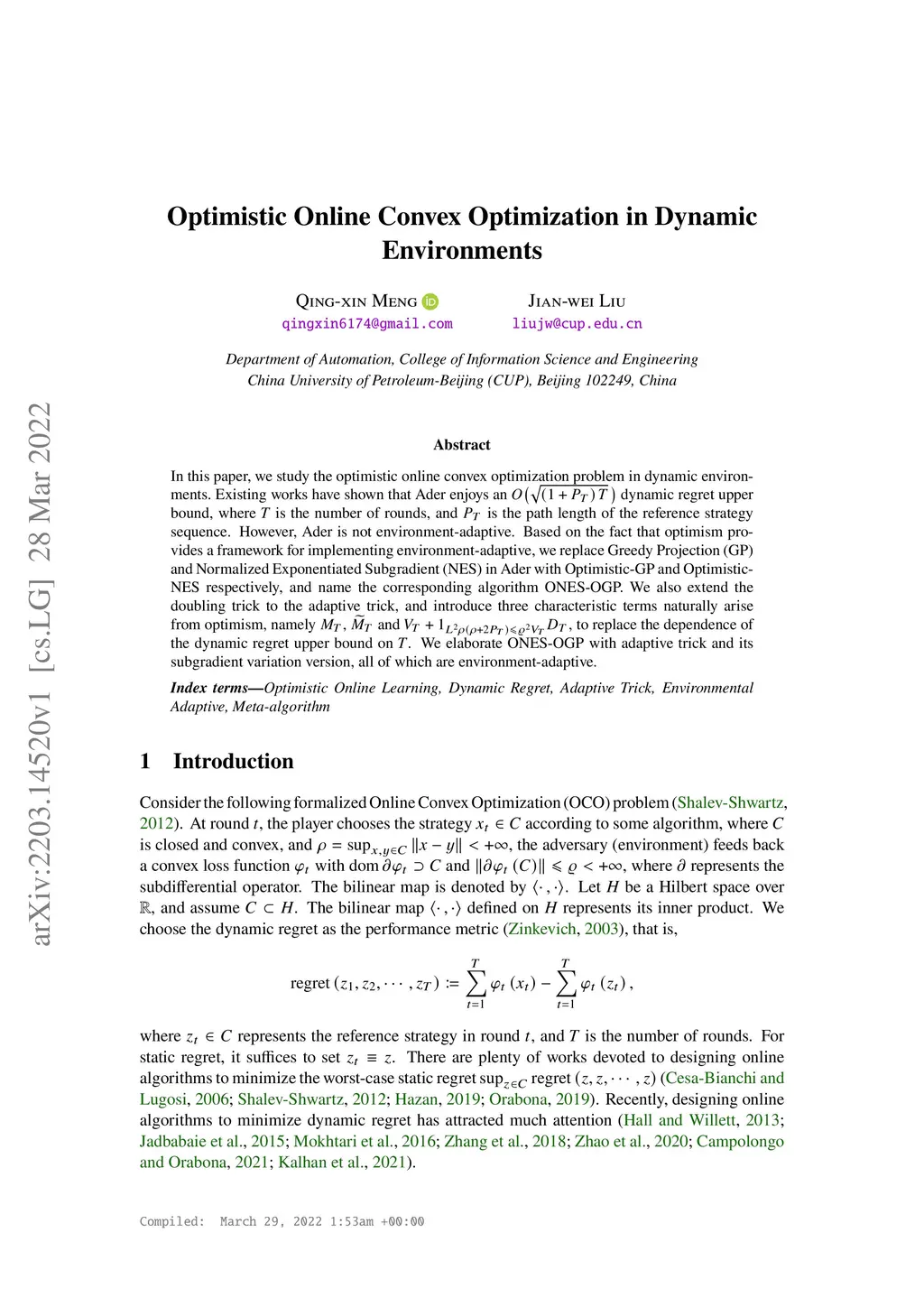 In this paper, we study the optimistic online convex optimization problem in dynamic environments. Existing works have shown that Ader enjoys an dynamic regret upper bound, where is the number of rounds, and is the path length of the reference strategy sequence. However, Ader is not environment-adaptive. Based on the fact that optimism provides a framework for implementing environment-adaptive, we replace Greedy Projection (GP) and Normalized Exponentiated Subgradient (NES) in Ader with Optimistic-GP and Optimistic-NES respectively, and name the corresponding algorithm ONES-OGP. We also extend the doubling trick to the adaptive trick, and introduce three characteristic terms naturally arise from optimism, namely , and , to replace the dependence of the dynamic regret upper bound on . We elaborate ONES-OGP with adaptive trick and its subgradient variation version, all of which are environment-adaptive.