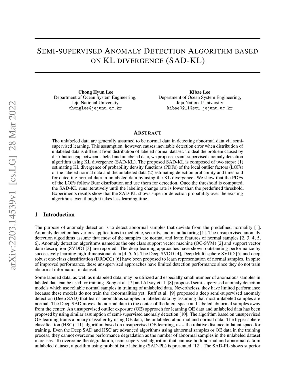 The unlabeled data are generally assumed to be normal data in detecting abnormal data via semisupervised learning. This assumption, however, causes inevitable detection error when distribution of unlabeled data is different from distribution of labeled normal dataset. To deal the problem caused by distribution gap between labeled and unlabeled data, we propose a semi-supervised anomaly detection algorithm using KL divergence (SAD-KL). The proposed SAD-KL is composed of two steps: (1) estimating KL divergence of probability density functions (PDFs) of the local outlier factors (LOFs) of the labeled normal data and the unlabeled data (2) estimating detection probability and threshold for detecting normal data in unlabeled data by using the KL divergence. We show that the PDFs of the LOFs follow Burr distribution and use them for detection. Once the threshold is computed, the SAD-KL runs iteratively until the labeling change rate is lower than the predefined threshold. Experiments results show that the SAD-KL shows superior detection probability over the existing algorithms even though it takes less learning time.