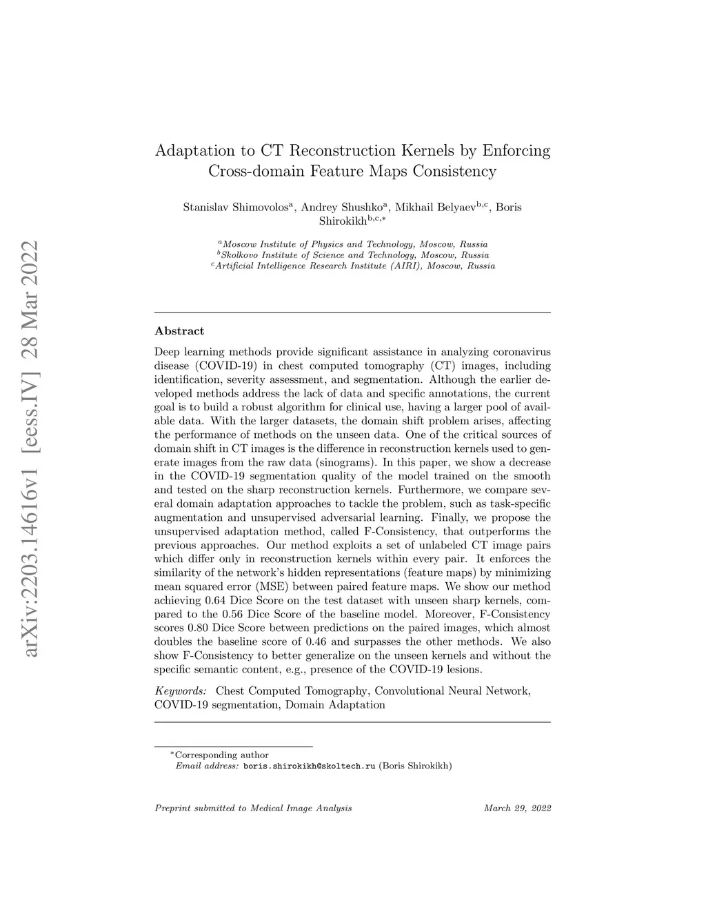 Deep learning methods provide significant assistance in analyzing coronavirus disease (COVID-19) in chest computed tomography (CT) images, including identification, severity assessment, and segmentation. Although the earlier developed methods address the lack of data and specific annotations, the current goal is to build a robust algorithm for clinical use, having a larger pool of available data. With the larger datasets, the domain shift problem arises, affecting the performance of methods on the unseen data. One of the critical sources of domain shift in CT images is the difference in reconstruction kernels used to generate images from the raw data (sinograms). In this paper, we show a decrease in the COVID-19 segmentation quality of the model trained on the smooth and tested on the sharp reconstruction kernels. Furthermore, we compare several domain adaptation approaches to tackle the problem, such as task-specific augmentation and unsupervised adversarial learning. Finally, we propose the unsupervised adaptation method, called F-Consistency, that outperforms the previous approaches. Our method exploits a set of unlabeled CT image pairs which differ only in reconstruction kernels within every pair. It enforces the similarity of the network hidden representations (feature maps) by minimizing mean squared error (MSE) between paired feature maps. We show our method achieving 0.64 Dice Score on the test dataset with unseen sharp kernels, compared to the 0.56 Dice Score of the baseline model. Moreover, F-Consistency scores 0.80 Dice Score between predictions on the paired images, which almost doubles the baseline score of 0.46 and surpasses the other methods. We also show F-Consistency to better generalize on the unseen kernels and without the specific semantic content, e.g., presence of the COVID-19 lesions.