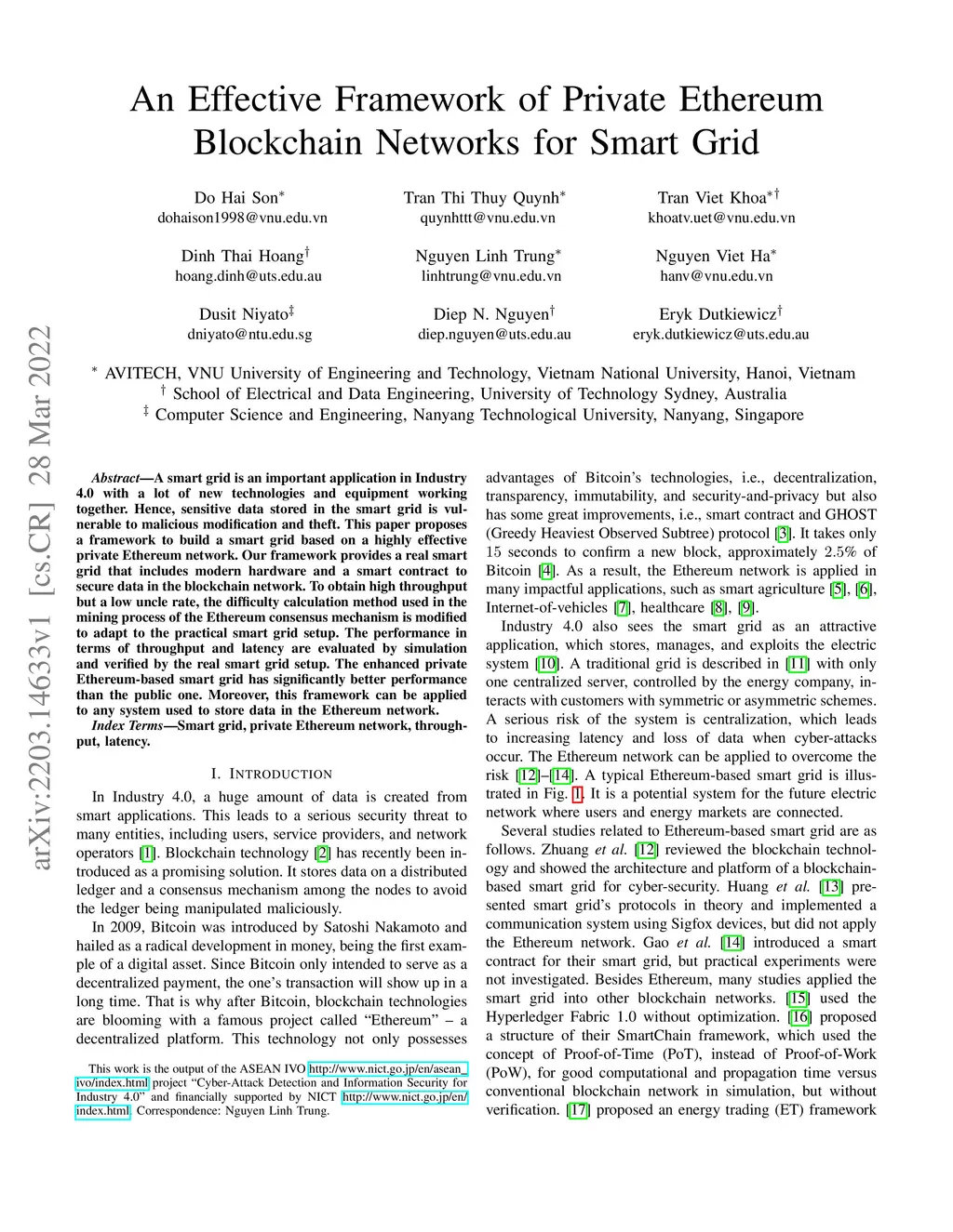A smart grid is an important application in Industry 4.0 with a lot of new technologies and equipment working together. Hence, sensitive data stored in the smart grid is vulnerable to malicious modification and theft. This paper proposes a framework to build a smart grid based on a highly effective private Ethereum network. Our framework provides a real smart grid that includes modern hardware and a smart contract to secure data in the blockchain network. To obtain high throughput but a low uncle rate, the difficulty calculation method used in the mining process of the Ethereum consensus mechanism is modified to adapt to the practical smart grid setup. The performance in terms of throughput and latency are evaluated by simulation and verified by the real smart grid setup. The enhanced private Ethereum-based smart grid has significantly better performance than the public one. Moreover, this framework can be applied to any system used to store data in the Ethereum network.