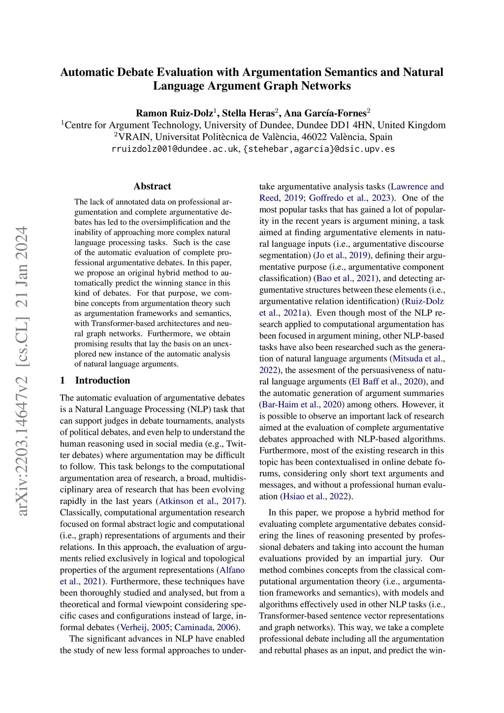 The lack of annotated data on professional argumentation and complete argumentative debates has led to the oversimplification and the inability of approaching more complex natural language processing tasks. Such is the case of the automatic debate evaluation. In this paper, we propose an original hybrid method to automatically evaluate argumentative debates. For that purpose, we combine concepts from argumentation theory such as argumentation frameworks and semantics, with Transformer-based architectures and neural graph networks. Furthermore, we obtain promising results that lay the basis on an unexplored new instance of the automatic analysis of natural language arguments.