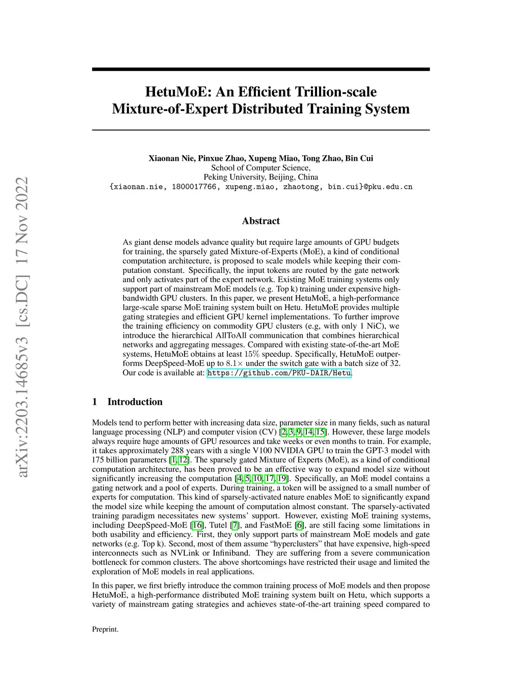 As giant dense models advance quality but require large amounts of GPU budgets for training, the sparsely gated Mixture-of-Experts (MoE), a kind of conditional computation architecture, is proposed to scale models while keeping their computation constant. Specifically, the input tokens are routed by the gate network and only activates part of the expert network. Existing MoE training systems only support part of mainstream MoE models (e.g. Top k) training under expensive high-bandwidth GPU clusters. In this paper, we present HetuMoE, a high-performance large-scale sparse MoE training system built on Hetu. HetuMoE provides multiple gating strategies and efficient GPU kernel implementations. To further improve the training efficiency on commodity GPU clusters (e.g, with only 1 NiC), we introduce the hierarchical AllToAll communication that combines hierarchical networks and aggregating messages. Compared with existing state-of-the-art MoE systems, HetuMoE obtains at least 15% speedup. Specifically, HetuMoE outperforms DeepSpeed-MoE up to 8.1x under the switch gate with a batch size of 32. Our code is available at: https://github.com/PKU-DAIR/Hetu.