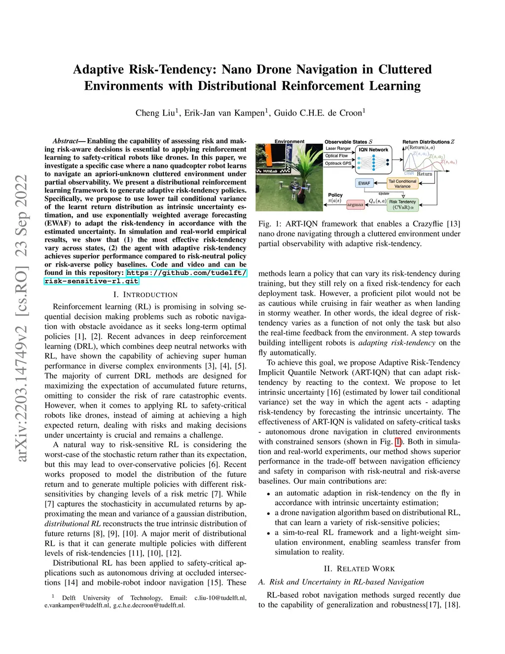 Enabling the capability of assessing risk and making risk-aware decisions is essential to applying reinforcement learning to safety-critical robots like drones. In this paper, we investigate a specific case where a nano quadcopter robot learns to navigate an apriori-unknown cluttered environment under partial observability. We present a distributional reinforcement learning framework to generate adaptive risk-tendency policies. Specifically, we propose to use lower tail conditional variance of the learnt return distribution as intrinsic uncertainty estimation, and use exponentially weighted average forecasting (EWAF) to adapt the risk-tendency in accordance with the estimated uncertainty. In simulation and real-world empirical results, we show that (1) the most effective risk-tendency vary across states, (2) the agent with adaptive risk-tendency achieves superior performance compared to risk-neutral policy or risk-averse policy baselines.
