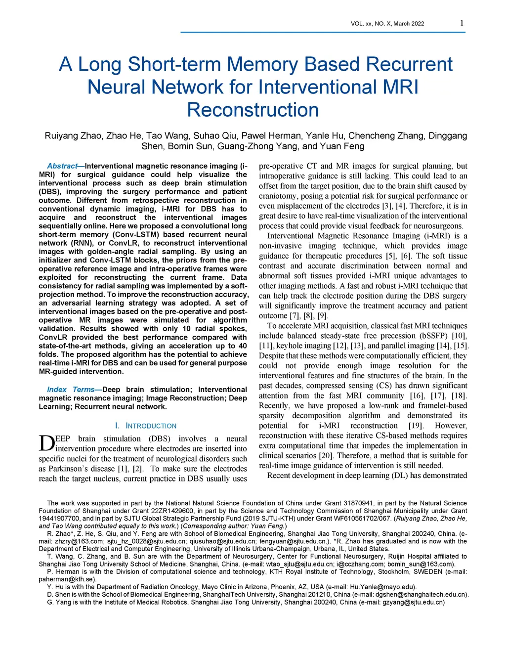 Interventional magnetic resonance imaging (i-MRI) for surgical guidance could help visualize the interventional process such as deep brain stimulation (DBS), improving the surgery performance and patient outcome. Different from retrospective reconstruction in conventional dynamic imaging, i-MRI for DBS has to acquire and reconstruct the interventional images sequentially online. Here we proposed a convolutional long short-term memory (Conv-LSTM) based recurrent neural network (RNN), or ConvLR, to reconstruct interventional images with golden-angle radial sampling. By using an initializer and Conv-LSTM blocks, the priors from the pre-operative reference image and intra-operative frames were exploited for reconstructing the current frame. Data consistency for radial sampling was implemented by a soft-projection method. To improve the reconstruction accuracy, an adversarial learning strategy was adopted. A set of interventional images based on the pre-operative and post-operative MR images were simulated for algorithm validation. Results showed with only 10 radial spokes, ConvLR provided the best performance compared with state-of-the-art methods, giving an acceleration up to 40 folds. The proposed algorithm has the potential to achieve real-time i-MRI for DBS and can be used for general purpose MR-guided intervention.