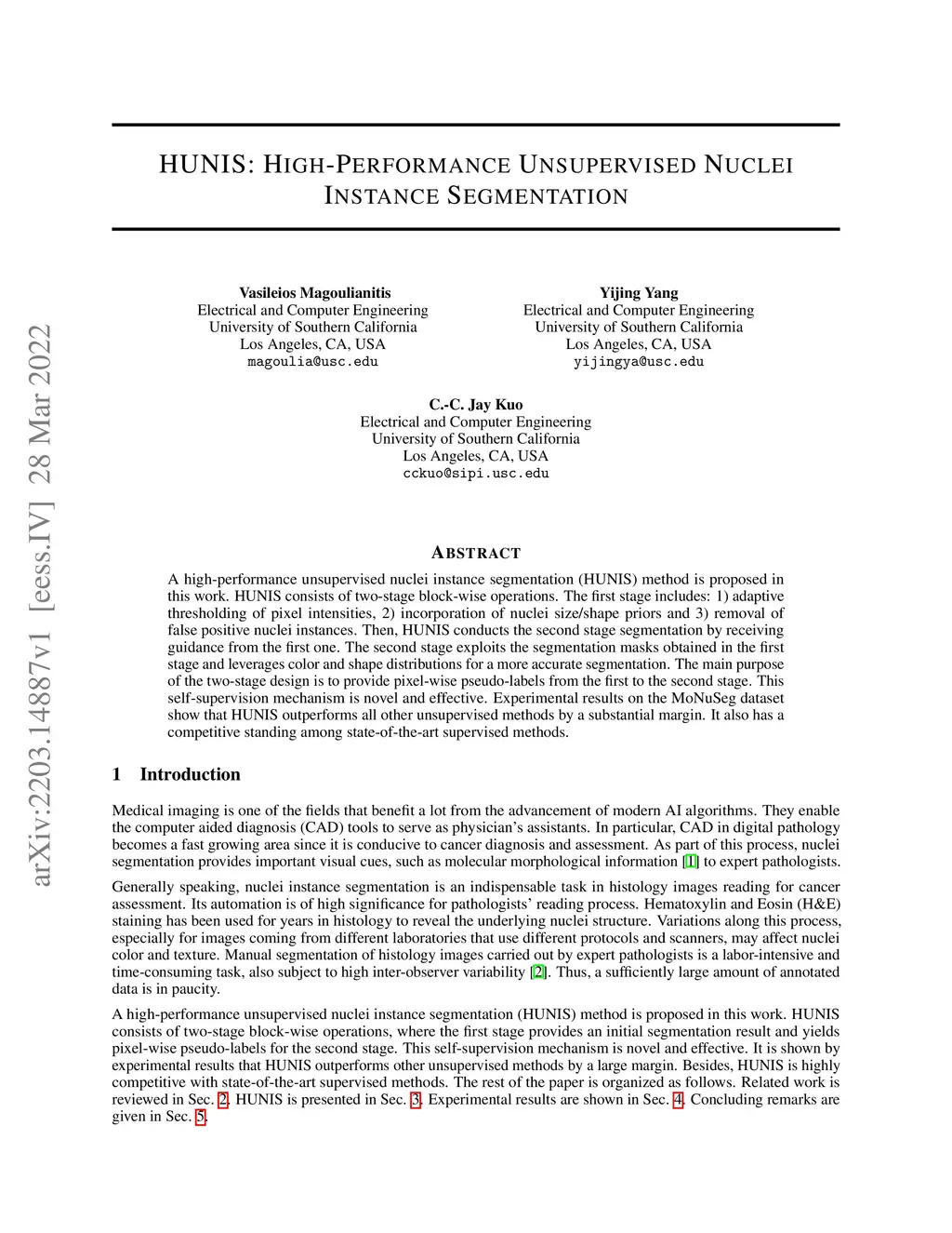 A high-performance unsupervised nuclei instance segmentation (HUNIS) method is proposed in this work. HUNIS consists of two-stage block-wise operations. The first stage includes: 1) adaptive thresholding of pixel intensities, 2) incorporation of nuclei size/shape priors and 3) removal of false positive nuclei instances. Then, HUNIS conducts the second stage segmentation by receiving guidance from the first one. The second stage exploits the segmentation masks obtained in the first stage and leverages color and shape distributions for a more accurate segmentation. The main purpose of the two-stage design is to provide pixel-wise pseudo-labels from the first to the second stage. This self-supervision mechanism is novel and effective. Experimental results on the MoNuSeg dataset show that HUNIS outperforms all other unsupervised methods by a substantial margin. It also has a competitive standing among state-of-the-art supervised methods.