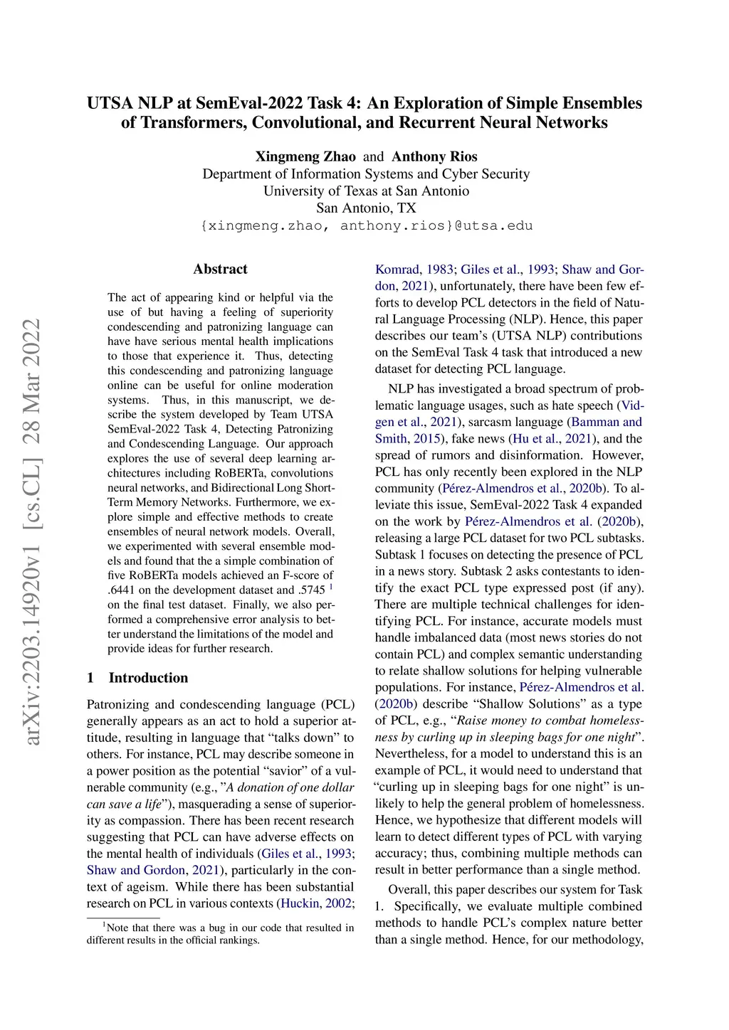 The act of appearing kind or helpful via the use of but having a feeling of superiority condescending and patronizing language can have have serious mental health implications to those that experience it. Thus, detecting this condescending and patronizing language online can be useful for online moderation systems. Thus, in this manuscript, we describe the system developed by Team UTSA SemEval-2022 Task 4, Detecting Patronizing and Condescending Language. Our approach explores the use of several deep learning architectures including RoBERTa, convolutions neural networks, and Bidirectional Long Short-Term Memory Networks. Furthermore, we explore simple and effective methods to create ensembles of neural network models. Overall, we experimented with several ensemble models and found that the a simple combination of five RoBERTa models achieved an F-score of .6441 on the development dataset and .5745 on the final test dataset. Finally, we also performed a comprehensive error analysis to better understand the limitations of the model and provide ideas for further research.