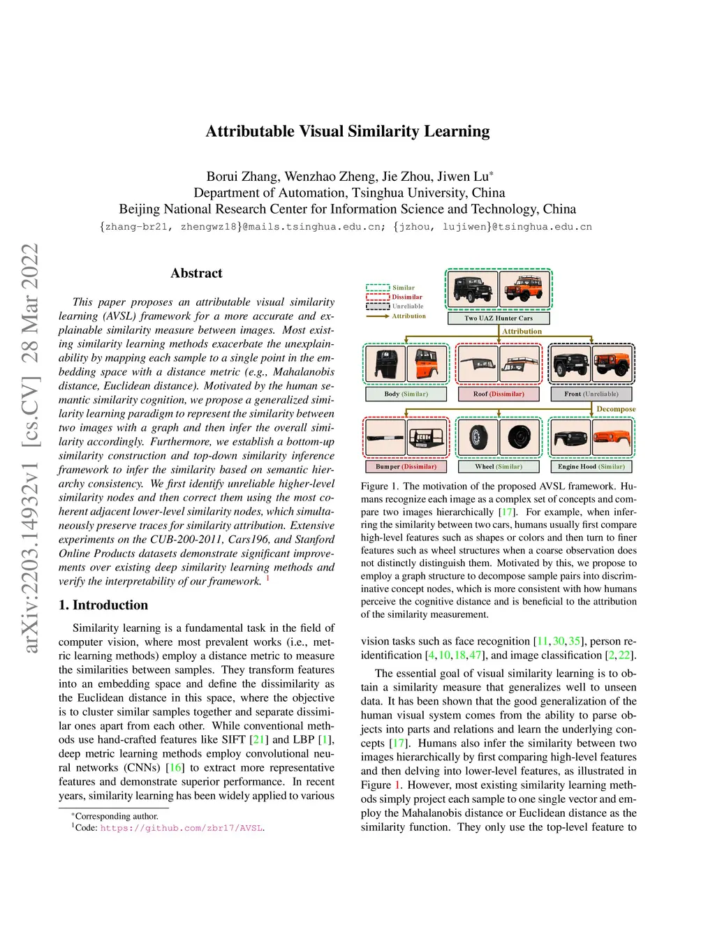 This paper proposes an attributable visual similarity learning (AVSL) framework for a more accurate and explainable similarity measure between images. Most existing similarity learning methods exacerbate the unexplainability by mapping each sample to a single point in the embedding space with a distance metric (e.g., Mahalanobis distance, Euclidean distance). Motivated by the human semantic similarity cognition, we propose a generalized similarity learning paradigm to represent the similarity between two images with a graph and then infer the overall similarity accordingly. Furthermore, we establish a bottom-up similarity construction and top-down similarity inference framework to infer the similarity based on semantic hierarchy consistency. We first identify unreliable higher-level similarity nodes and then correct them using the most coherent adjacent lower-level similarity nodes, which simultaneously preserve traces for similarity attribution. Extensive experiments on the CUB-200-2011, Cars196, and Stanford Online Products datasets demonstrate significant improvements over existing deep similarity learning methods and verify the interpretability of our framework. Code is available at https://github.com/zbr17/AVSL.