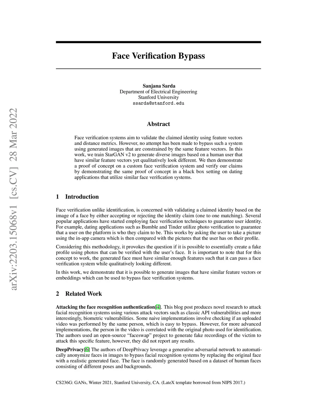 Face verification systems aim to validate the claimed identity using feature vectors and distance metrics. However, no attempt has been made to bypass such a system using generated images that are constrained by the same feature vectors. In this work, we train StarGAN v2 to generate diverse images based on a human user, that have similar feature vectors yet qualitatively look different. We then demonstrate a proof of concept on a custom face verification system and verify our claims by demonstrating the same proof of concept in a black box setting on dating applications that utilize similar face verification systems.