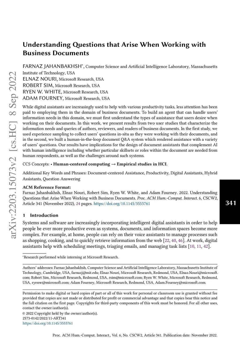 While digital assistants are increasingly used to help with various productivity tasks, less attention has been paid to employing them in the domain of business documents. To build an agent that can handle users' information needs in this domain, we must first understand the types of assistance that users desire when working on their documents. In this work, we present results from two user studies that characterize the information needs and queries of authors, reviewers, and readers of business documents. In the first study, we used experience sampling to collect users' questions in-situ as they were working with their documents, and in the second, we built a human-in-the-loop document Q&A system which rendered assistance with a variety of users' questions. Our results have implications for the design of document assistants that complement AI with human intelligence including whether particular skillsets or roles within the document are needed from human respondents, as well as the challenges around such systems.