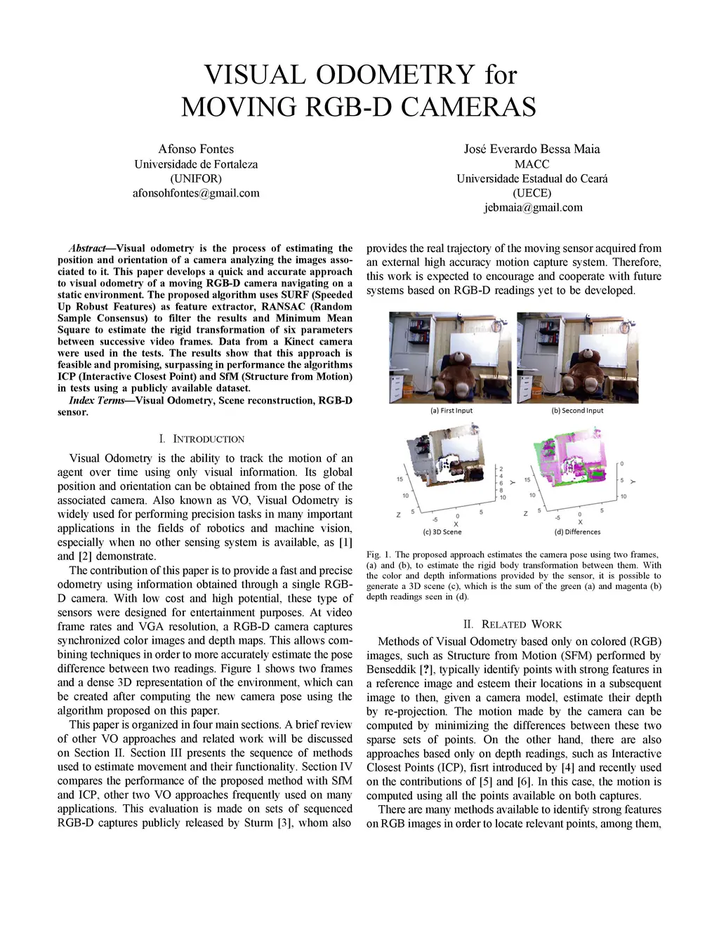 Visual odometry is the process of estimating the position and orientation of a camera by analyzing the images associated to it. This paper develops a quick and accurate approach to visual odometry of a moving RGB-D camera navigating on a static environment. The proposed algorithm uses SURF (Speeded Up Robust Features) as feature extractor, RANSAC (Random Sample Consensus) to filter the results and Minimum Mean Square to estimate the rigid transformation of six parameters between successive video frames. Data from a Kinect camera were used in the tests. The results show that this approach is feasible and promising, surpassing in performance the algorithms ICP (Interactive Closest Point) and SfM (Structure from Motion) in tests using a publicly available dataset.