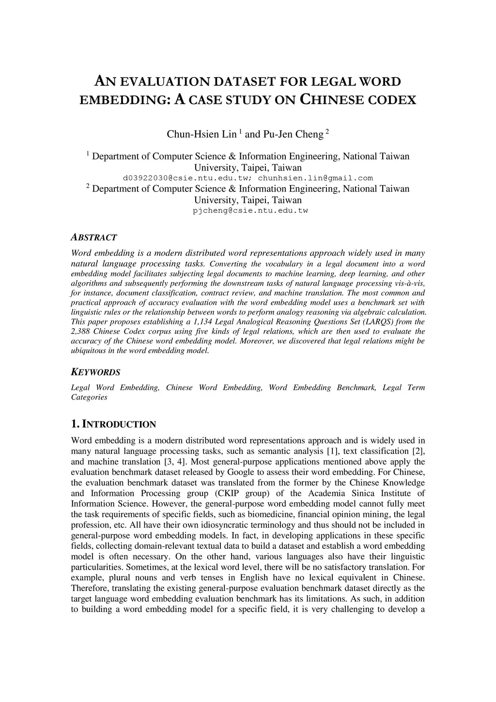 An Evaluation Dataset for Legal Word Embedding: A Case Study On Chinese