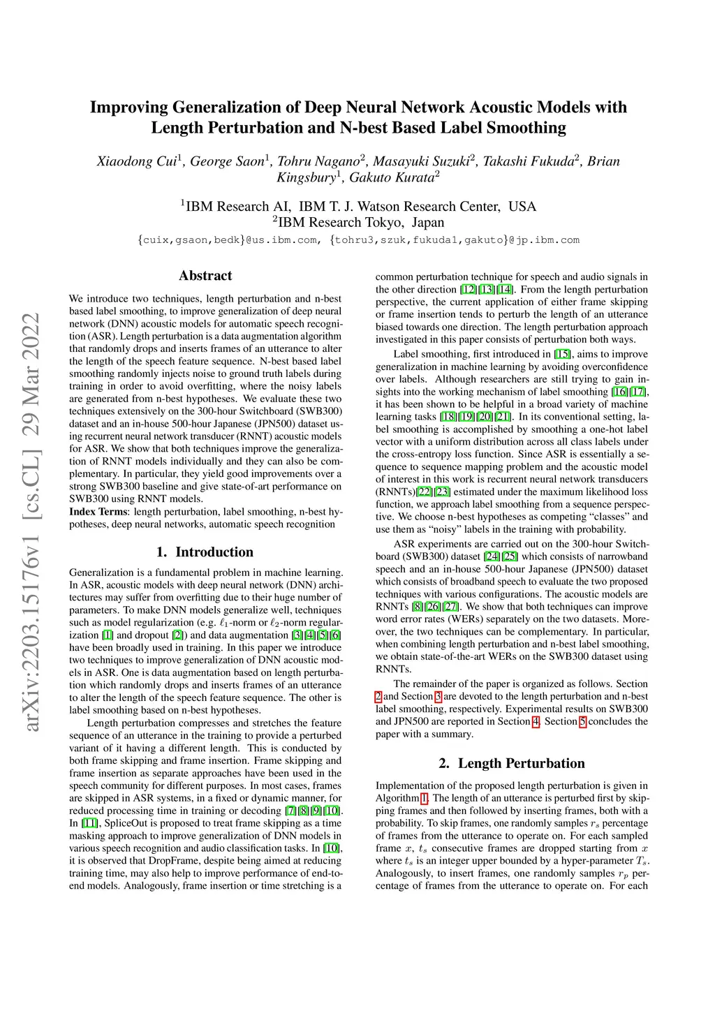 We introduce two techniques, length perturbation and n-best based label smoothing, to improve generalization of deep neural network (DNN) acoustic models for automatic speech recognition (ASR). Length perturbation is a data augmentation algorithm that randomly drops and inserts frames of an utterance to alter the length of the speech feature sequence. N-best based label smoothing randomly injects noise to ground truth labels during training in order to avoid overfitting, where the noisy labels are generated from n-best hypotheses. We evaluate these two techniques extensively on the 300-hour Switchboard (SWB300) dataset and an in-house 500-hour Japanese (JPN500) dataset using recurrent neural network transducer (RNNT) acoustic models for ASR. We show that both techniques improve the generalization of RNNT models individually and they can also be complementary. In particular, they yield good improvements over a strong SWB300 baseline and give state-of-art performance on SWB300 using RNNT models.