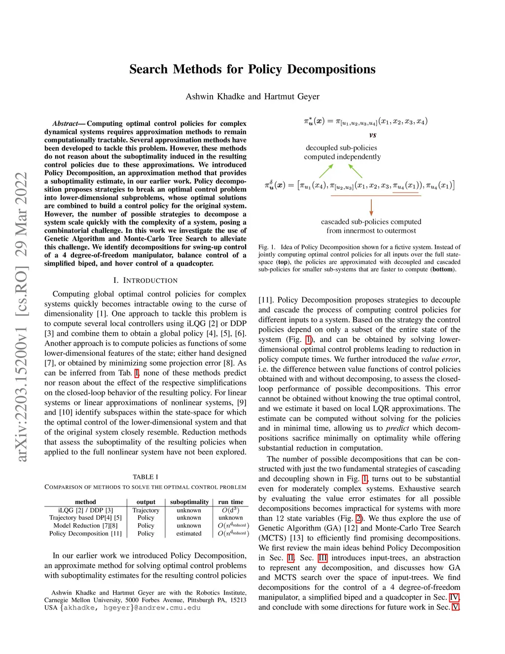 Computing optimal control policies for complex dynamical systems requires approximation methods to remain computationally tractable. Several approximation methods have been developed to tackle this problem. However, these methods do not reason about the suboptimality induced in the resulting control policies due to these approximations. We introduced Policy Decomposition, an approximation method that provides a suboptimality estimate, in our earlier work. Policy decomposition proposes strategies to break an optimal control problem into lower-dimensional subproblems, whose optimal solutions are combined to build a control policy for the original system. However, the number of possible strategies to decompose a system scale quickly with the complexity of a system, posing a combinatorial challenge. In this work we investigate the use of Genetic Algorithm and Monte-Carlo Tree Search to alleviate this challenge. We identify decompositions for swing-up control of a 4 degree-of-freedom manipulator, balance control of a simplified biped, and hover control of a quadcopter.