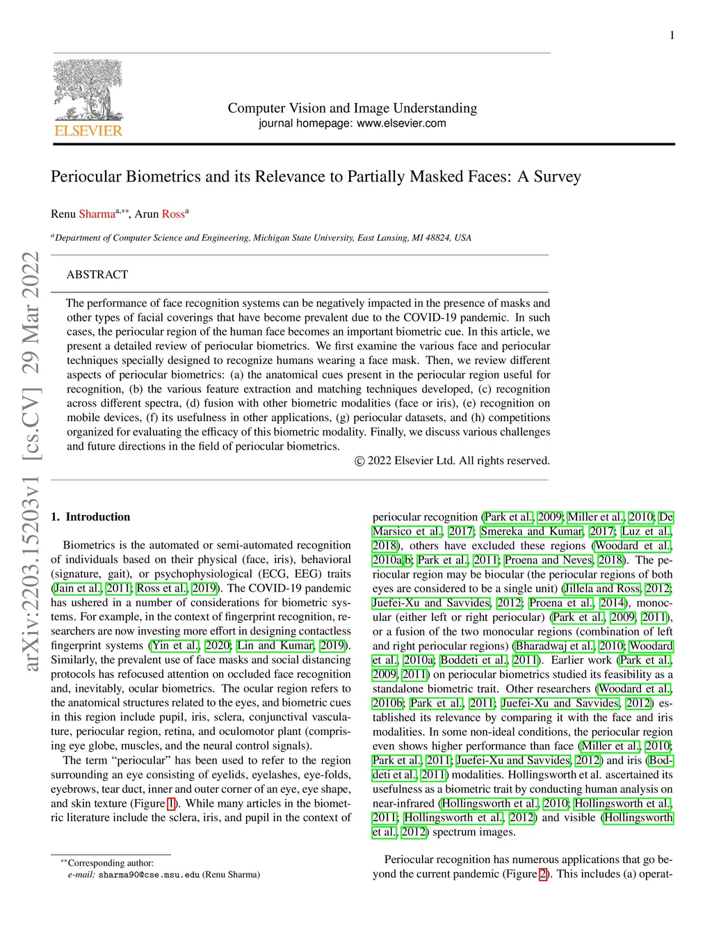 The performance of face recognition systems can be negatively impacted in the presence of masks and other types of facial coverings that have become prevalent due to the COVID-19 pandemic. In such cases, the periocular region of the human face becomes an important biometric cue. In this article, we present a detailed review of periocular biometrics. We first examine the various face and periocular techniques specially designed to recognize humans wearing a face mask. Then, we review different aspects of periocular biometrics: (a) the anatomical cues present in the periocular region useful for recognition, (b) the various feature extraction and matching techniques developed, (c) recognition across different spectra, (d) fusion with other biometric modalities (face or iris), (e) recognition on mobile devices, (f) its usefulness in other applications, (g) periocular datasets, and (h) competitions organized for evaluating the efficacy of this biometric modality. Finally, we discuss various challenges and future directions in the field of periocular biometrics.