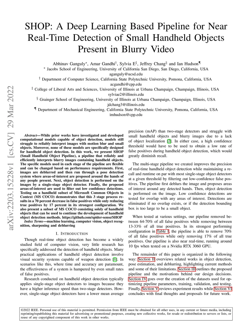 While prior works have investigated and developed computational models capable of object detection, models still struggle to reliably interpret images with motion blur and small objects. Moreover, none of these models are specifically designed for handheld object detection. In this work, we present SHOP (Small Handheld Object Pipeline), a pipeline that reliably and efficiently interprets blurry images containing handheld objects. The specific models used in each stage of the pipeline are flexible and can be changed based on performance requirements. First, images are deblurred and then run through a pose detection system where areas-of-interest are proposed around the hands of any people present. Next, object detection is performed on the images by a single-stage object detector. Finally, the proposed areas-of-interest are used to filter out low confidence detections. Testing on a handheld subset of Microsoft Common Objects in Context (MS COCO) demonstrates that this 3 stage process results in a 70 percent decrease in false positives while only reducing true positives by 17 percent in its strongest configuration. We also present a subset of MS COCO consisting solely of handheld objects that can be used to continue the development of handheld object detection methods. https://github.com/spider-sense/SHOP