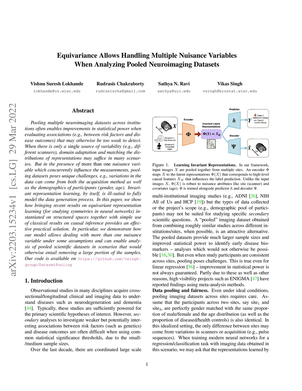 Pooling multiple neuroimaging datasets across institutions often enables improvements in statistical power when evaluating associations (e.g., between risk factors and disease outcomes) that may otherwise be too weak to detect. When there is only a {\em single} source of variability (e.g., different scanners), domain adaptation and matching the distributions of representations may suffice in many scenarios. But in the presence of {\em more than one} nuisance variable which concurrently influence the measurements, pooling datasets poses unique challenges, e.g., variations in the data can come from both the acquisition method as well as the demographics of participants (gender, age). Invariant representation learning, by itself, is ill-suited to fully model the data generation process. In this paper, we show how bringing recent results on equivariant representation learning (for studying symmetries in neural networks) instantiated on structured spaces together with simple use of classical results on causal inference provides an effective practical solution. In particular, we demonstrate how our model allows dealing with more than one nuisance variable under some assumptions and can enable analysis of pooled scientific datasets in scenarios that would otherwise entail removing a large portion of the samples.