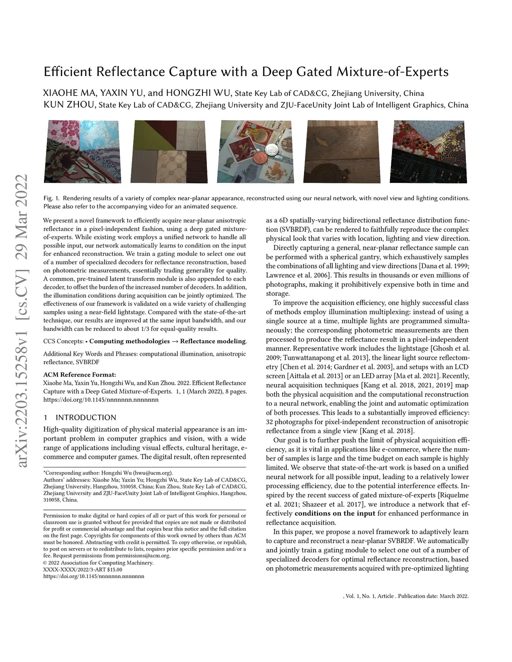 We present a novel framework to efficiently acquire near-planar anisotropic reflectance in a pixel-independent fashion, using a deep gated mixtureof-experts. While existing work employs a unified network to handle all possible input, our network automatically learns to condition on the input for enhanced reconstruction. We train a gating module to select one out of a number of specialized decoders for reflectance reconstruction, based on photometric measurements, essentially trading generality for quality. A common, pre-trained latent transform module is also appended to each decoder, to offset the burden of the increased number of decoders. In addition, the illumination conditions during acquisition can be jointly optimized. The effectiveness of our framework is validated on a wide variety of challenging samples using a near-field lightstage. Compared with the state-of-the-art technique, our results are improved at the same input bandwidth, and our bandwidth can be reduced to about 1/3 for equal-quality results.