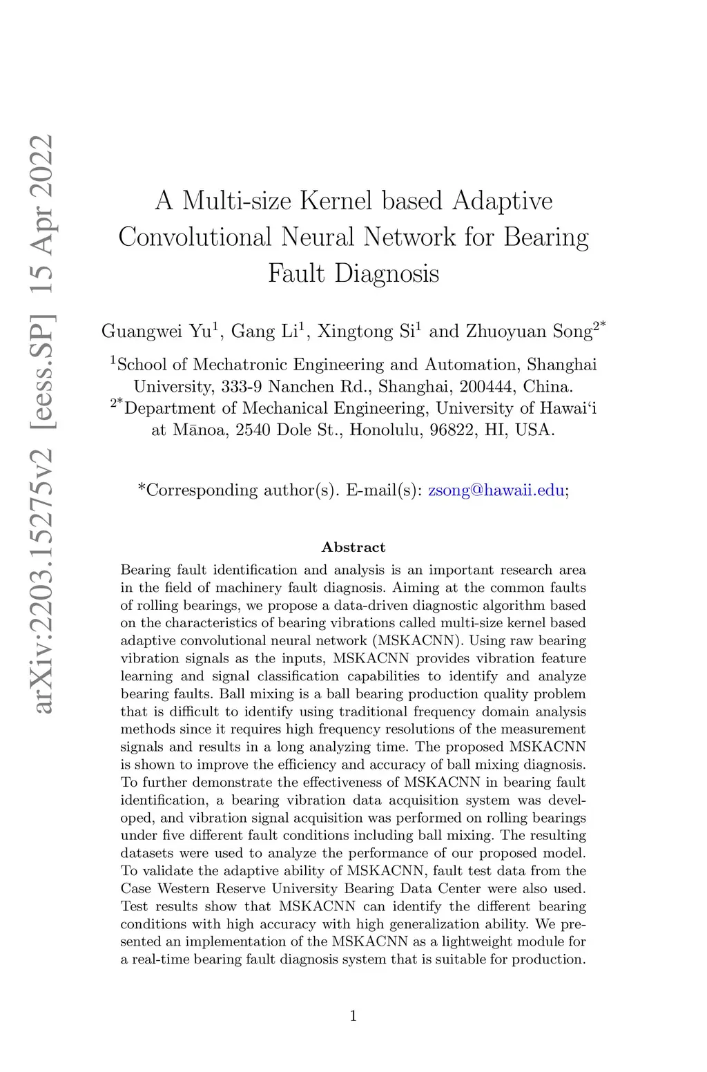 Bearing fault identification and analysis is an important research area in the field of machinery fault diagnosis. Aiming at the common faults of rolling bearings, we propose a data-driven diagnostic algorithm based on the characteristics of bearing vibrations called multi-size kernel based adaptive convolutional neural network (MSKACNN). Using raw bearing vibration signals as the inputs, MSKACNN provides vibration feature learning and signal classification capabilities to identify and analyze bearing faults. Ball mixing is a ball bearing production quality problem that is difficult to identify using traditional frequency domain analysis methods since it requires high frequency resolutions of the measurement signals and results in a long analyzing time. The proposed MSKACNN is shown to improve the efficiency and accuracy of ball mixing diagnosis. To further demonstrate the effectiveness of MSKACNN in bearing fault identification, a bearing vibration data acquisition system was developed, and vibration signal acquisition was performed on rolling bearings under five different fault conditions including ball mixing. The resulting datasets were used to analyze the performance of our proposed model. To validate the adaptive ability of MSKACNN, fault test data from the Case Western Reserve University Bearing Data Center were also used. Test results show that MSKACNN can identify the different bearing conditions with high accuracy with high generalization ability. We presented an implementation of the MSKACNN as a lightweight module for a real-time bearing fault diagnosis system that is suitable for production.