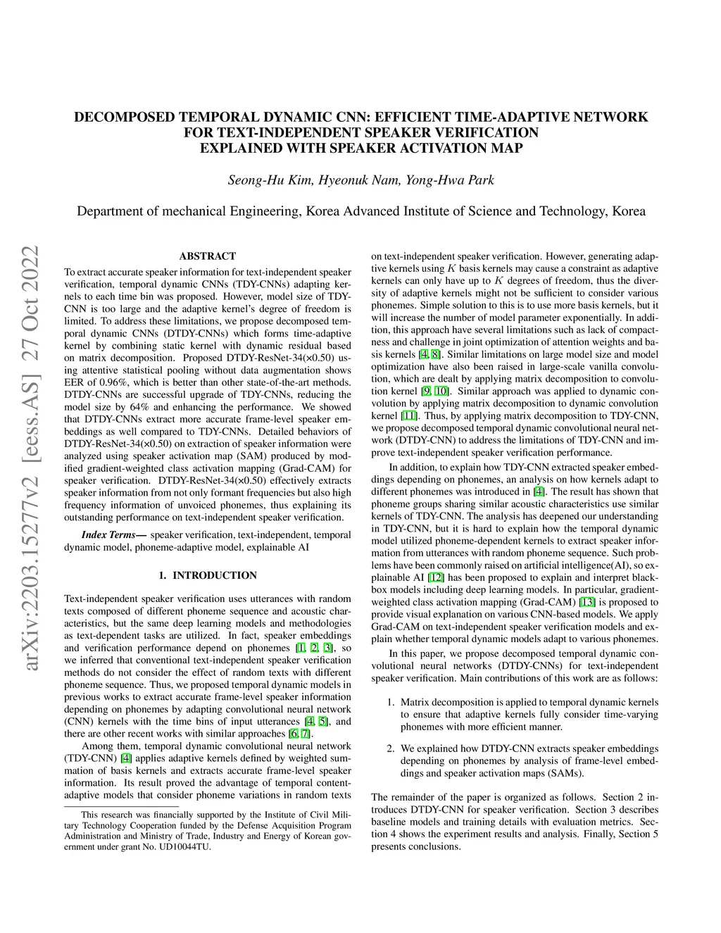 To extract accurate speaker information for text-independent speaker verification, temporal dynamic CNNs (TDY-CNNs) adapting kernels to each time bin was proposed. However, model size of TDY-CNN is too large and the adaptive kernel's degree of freedom is limited. To address these limitations, we propose decomposed temporal dynamic CNNs (DTDY-CNNs) which forms time-adaptive kernel by combining static kernel with dynamic residual based on matrix decomposition. Proposed DTDY-ResNet-34(x0.50) using attentive statistical pooling without data augmentation shows EER of 0.96%, which is better than other state-of-the-art methods. DTDY-CNNs are successful upgrade of TDY-CNNs, reducing the model size by 64% and enhancing the performance. We showed that DTDY-CNNs extract more accurate frame-level speaker embeddings as well compared to TDY-CNNs. Detailed behaviors of DTDY-ResNet-34(x0.50) on extraction of speaker information were analyzed using speaker activation map (SAM) produced by modified gradient-weighted class activation mapping (Grad-CAM) for speaker verification. DTDY-ResNet-34(x0.50) effectively extracts speaker information from not only formant frequencies but also high frequency information of unvoiced phonemes, thus explaining its outstanding performance on text-independent speaker verification.