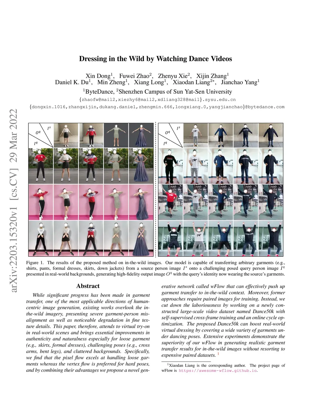 While significant progress has been made in garment transfer, one of the most applicable directions of human-centric image generation, existing works overlook the in-the-wild imagery, presenting severe garment-person misalignment as well as noticeable degradation in fine texture details. This paper, therefore, attends to virtual try-on in real-world scenes and brings essential improvements in authenticity and naturalness especially for loose garment (e.g., skirts, formal dresses), challenging poses (e.g., cross arms, bent legs), and cluttered backgrounds. Specifically, we find that the pixel flow excels at handling loose garments whereas the vertex flow is preferred for hard poses, and by combining their advantages we propose a novel generative network called wFlow that can effectively push up garment transfer to in-the-wild context. Moreover, former approaches require paired images for training. Instead, we cut down the laboriousness by working on a newly constructed large-scale video dataset named Dance50k with self-supervised cross-frame training and an online cycle optimization. The proposed Dance50k can boost real-world virtual dressing by covering a wide variety of garments under dancing poses. Extensive experiments demonstrate the superiority of our wFlow in generating realistic garment transfer results for in-the-wild images without resorting to expensive paired datasets.