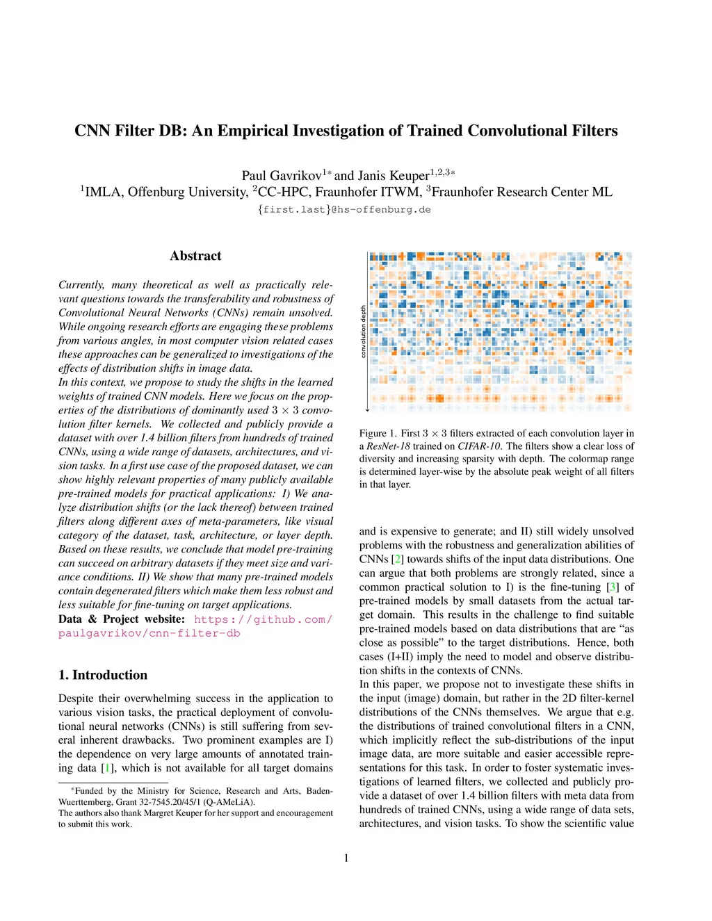 Currently, many theoretical as well as practically relevant questions towards the transferability and robustness of Convolutional Neural Networks (CNNs) remain unsolved. While ongoing research efforts are engaging these problems from various angles, in most computer vision related cases these approaches can be generalized to investigations of the effects of distribution shifts in image data. In this context, we propose to study the shifts in the learned weights of trained CNN models. Here we focus on the properties of the distributions of dominantly used 3x3 convolution filter kernels. We collected and publicly provide a dataset with over 1.4 billion filters from hundreds of trained CNNs, using a wide range of datasets, architectures, and vision tasks. In a first use case of the proposed dataset, we can show highly relevant properties of many publicly available pre-trained models for practical applications: I) We analyze distribution shifts (or the lack thereof) between trained filters along different axes of meta-parameters, like visual category of the dataset, task, architecture, or layer depth. Based on these results, we conclude that model pre-training can succeed on arbitrary datasets if they meet size and variance conditions. II) We show that many pre-trained models contain degenerated filters which make them less robust and less suitable for fine-tuning on target applications. Data & Project website: https://github.com/paulgavrikov/cnn-filter-db