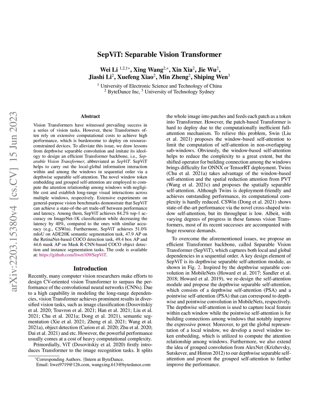 Vision Transformers have witnessed prevailing success in a series of vision tasks. However, these Transformers often rely on extensive computational costs to achieve high performance, which is burdensome to deploy on resource-constrained devices. To alleviate this issue, we draw lessons from depthwise separable convolution and imitate its ideology to design an efficient Transformer backbone, i.e., Separable Vision Transformer, abbreviated as SepViT. SepViT helps to carry out the local-global information interaction within and among the windows in sequential order via a depthwise separable self-attention. The novel window token embedding and grouped self-attention are employed to compute the attention relationship among windows with negligible cost and establish long-range visual interactions across multiple windows, respectively. Extensive experiments on general-purpose vision benchmarks demonstrate that SepViT can achieve a state-of-the-art trade-off between performance and latency. Among them, SepViT achieves 84.2% top-1 accuracy on ImageNet-1K classification while decreasing the latency by 40%, compared to the ones with similar accuracy (e.g., CSWin). Furthermore, SepViT achieves 51.0% mIoU on ADE20K semantic segmentation task, 47.9 AP on the RetinaNet-based COCO detection task, 49.4 box AP and 44.6 mask AP on Mask R-CNN-based COCO object detection and instance segmentation tasks.