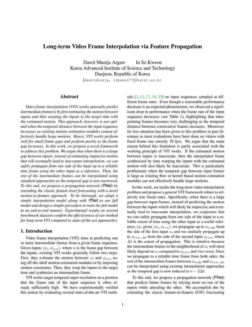 Video frame interpolation (VFI) works generally predict intermediate frame(s) by first estimating the motion between inputs and then warping the inputs to the target time with the estimated motion. This approach, however, is not optimal when the temporal distance between the input sequence increases as existing motion estimation modules cannot effectively handle large motions. Hence, VFI works perform well for small frame gaps and perform poorly as the frame gap increases. In this work, we propose a novel framework to address this problem. We argue that when there is a large gap between inputs, instead of estimating imprecise motion that will eventually lead to inaccurate interpolation, we can safely propagate from one side of the input up to a reliable time frame using the other input as a reference. Then, the rest of the intermediate frames can be interpolated using standard approaches as the temporal gap is now narrowed. To this end, we propose a propagation network (PNet) by extending the classic feature-level forecasting with a novel motion-to-feature approach. To be thorough, we adopt a simple interpolation model along with PNet as our full model and design a simple procedure to train the full model in an end-to-end manner. Experimental results on several benchmark datasets confirm the effectiveness of our method for long-term VFI compared to state-of-the-art approaches.