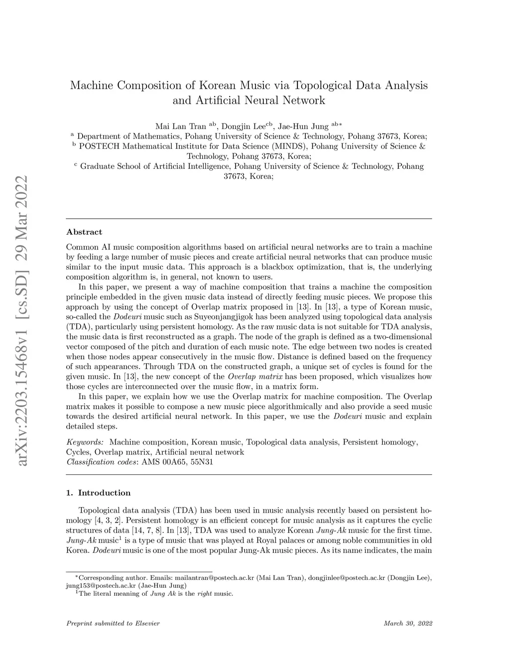 Common AI music composition algorithms based on artificial neural networks are to train a machine by feeding a large number of music pieces and create artificial neural networks that can produce music similar to the input music data. This approach is a blackbox optimization, that is, the underlying composition algorithm is, in general, not known to users. In this paper, we present a way of machine composition that trains a machine the composition principle embedded in the given music data instead of directly feeding music pieces. We propose this approach by using the concept of {\color{black}{Overlap}} matrix proposed in \cite{TPJ}. In \cite{TPJ}, a type of Korean music, so-called the {\it Dodeuri} music such as Suyeonjangjigok has been analyzed using topological data analysis (TDA), particularly using persistent homology. As the raw music data is not suitable for TDA analysis, the music data is first reconstructed as a graph. The node of the graph is defined as a two-dimensional vector composed of the pitch and duration of each music note. The edge between two nodes is created when those nodes appear consecutively in the music flow. Distance is defined based on the frequency of such appearances. Through TDA on the constructed graph, a unique set of cycles is found for the given music. In \cite{TPJ}, the new concept of the {\it {\color{black}{Overlap}} matrix} has been proposed, which visualizes how those cycles are interconnected over the music flow, in a matrix form. In this paper, we explain how we use the {\color{black}{Overlap}} matrix for machine composition. The {\color{black}{Overlap}} matrix makes it possible to compose a new music piece algorithmically and also provide a seed music towards the desired artificial neural network. In this paper, we use the {\it Dodeuri} music and explain detailed steps.