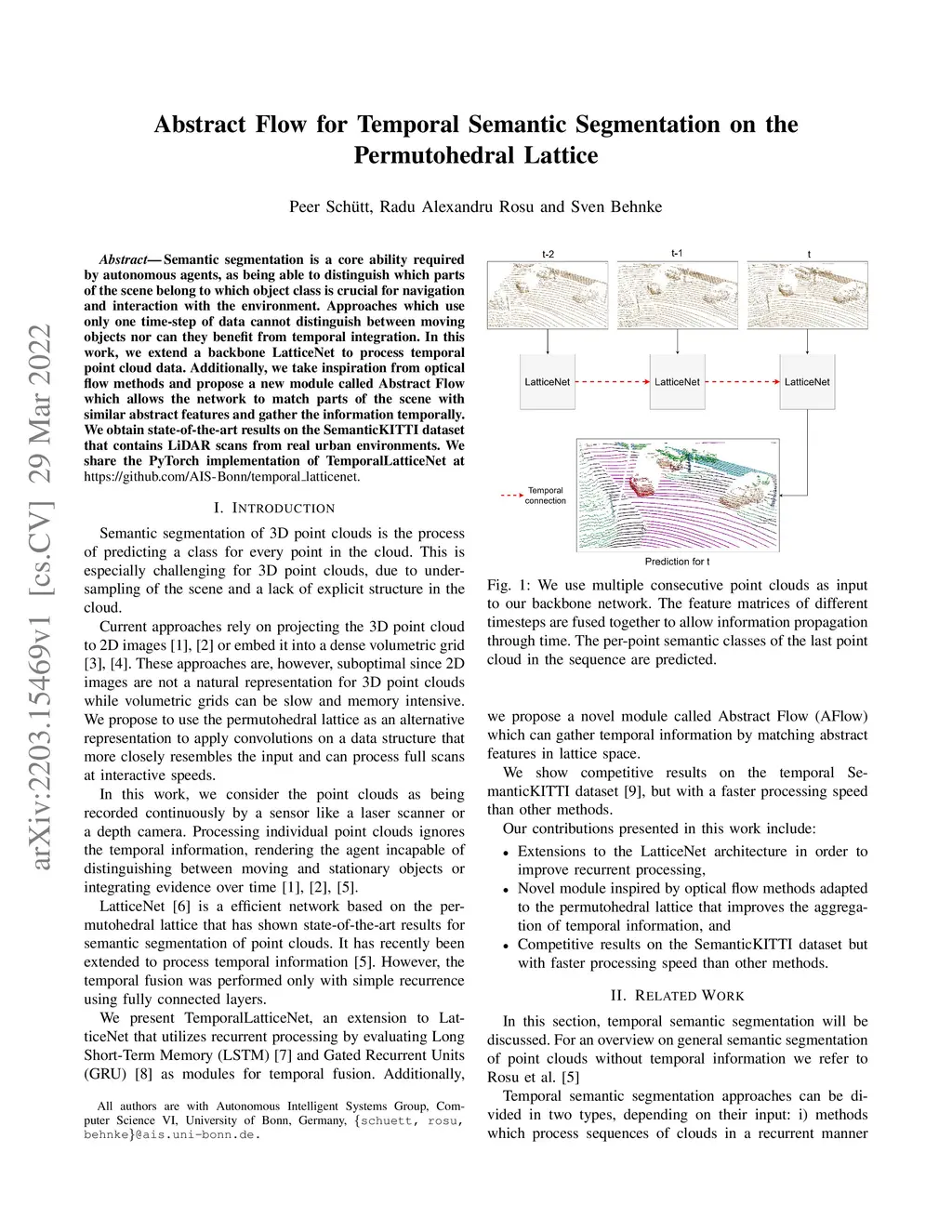 Semantic segmentation is a core ability required by autonomous agents, as being able to distinguish which parts of the scene belong to which object class is crucial for navigation and interaction with the environment. Approaches which use only one time-step of data cannot distinguish between moving objects nor can they benefit from temporal integration. In this work, we extend a backbone LatticeNet to process temporal point cloud data. Additionally, we take inspiration from optical flow methods and propose a new module called Abstract Flow which allows the network to match parts of the scene with similar abstract features and gather the information temporally. We obtain state-of-the-art results on the SemanticKITTI dataset that contains LiDAR scans from real urban environments. We share the PyTorch implementation of TemporalLatticeNet at https://github.com/AIS-Bonn/temporal_latticenet .