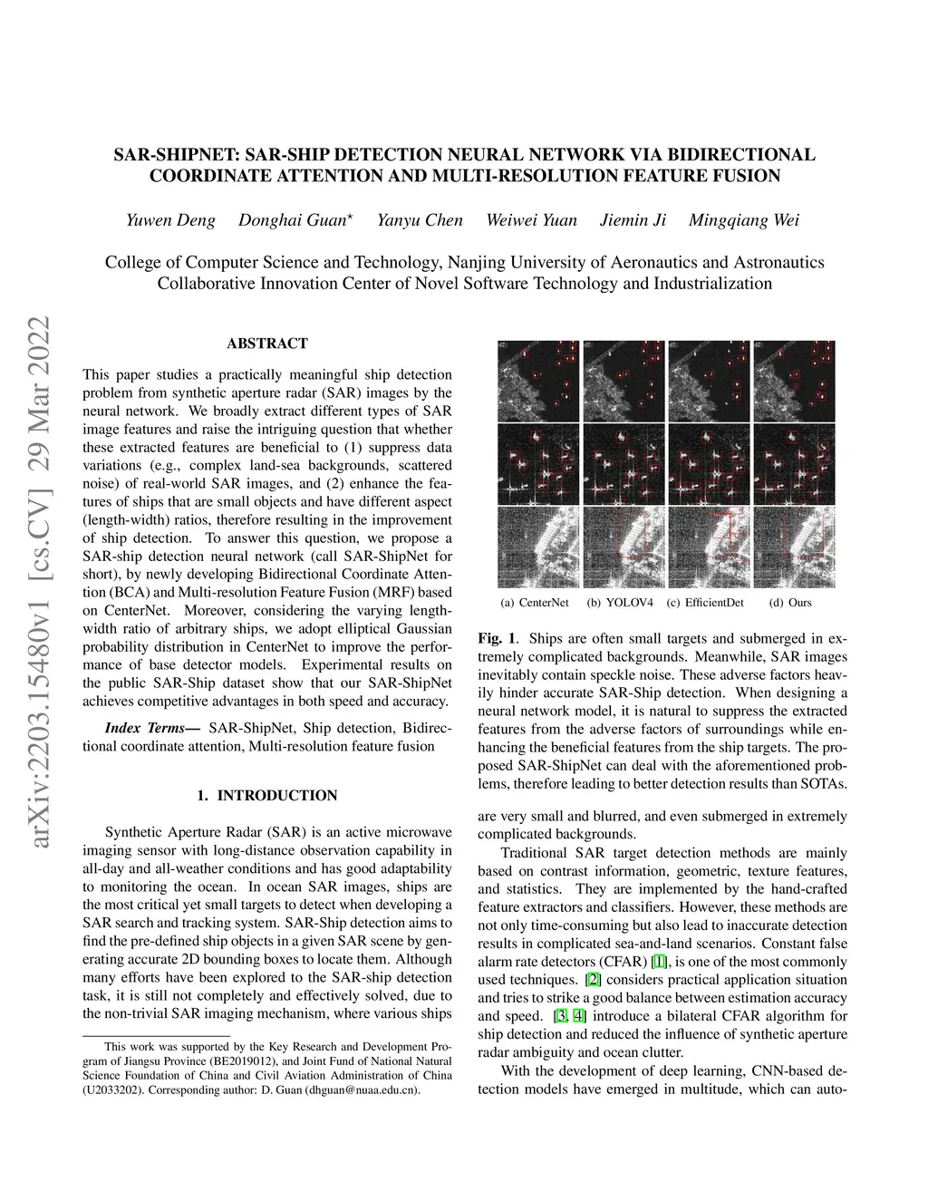 This paper studies a practically meaningful ship detection problem from synthetic aperture radar (SAR) images by the neural network. We broadly extract different types of SAR image features and raise the intriguing question that whether these extracted features are beneficial to (1) suppress data variations (e.g., complex land-sea backgrounds, scattered noise) of real-world SAR images, and (2) enhance the features of ships that are small objects and have different aspect (length-width) ratios, therefore resulting in the improvement of ship detection. To answer this question, we propose a SAR-ship detection neural network (call SAR-ShipNet for short), by newly developing Bidirectional Coordinate Attention (BCA) and Multi-resolution Feature Fusion (MRF) based on CenterNet. Moreover, considering the varying length-width ratio of arbitrary ships, we adopt elliptical Gaussian probability distribution in CenterNet to improve the performance of base detector models. Experimental results on the public SAR-Ship dataset show that our SAR-ShipNet achieves competitive advantages in both speed and accuracy.