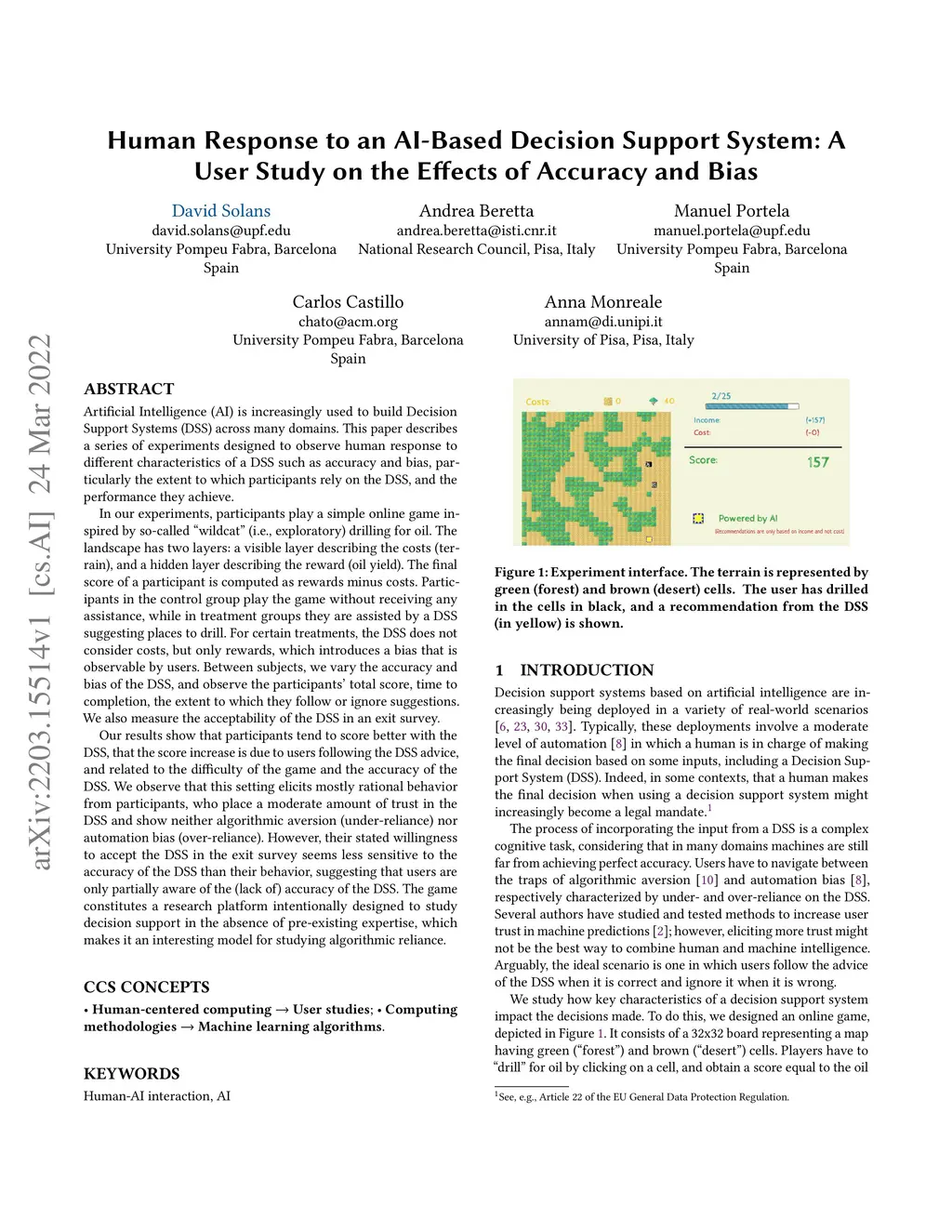 Artificial Intelligence (AI) is increasingly used to build Decision Support Systems (DSS) across many domains. This paper describes a series of experiments designed to observe human response to different characteristics of a DSS such as accuracy and bias, particularly the extent to which participants rely on the DSS, and the performance they achieve. In our experiments, participants play a simple online game inspired by so-called "wildcat" (i.e., exploratory) drilling for oil. The landscape has two layers: a visible layer describing the costs (terrain), and a hidden layer describing the reward (oil yield). Participants in the control group play the game without receiving any assistance, while in treatment groups they are assisted by a DSS suggesting places to drill. For certain treatments, the DSS does not consider costs, but only rewards, which introduces a bias that is observable by users. Between subjects, we vary the accuracy and bias of the DSS, and observe the participants' total score, time to completion, the extent to which they follow or ignore suggestions. We also measure the acceptability of the DSS in an exit survey. Our results show that participants tend to score better with the DSS, that the score increase is due to users following the DSS advice, and related to the difficulty of the game and the accuracy of the DSS. We observe that this setting elicits mostly rational behavior from participants, who place a moderate amount of trust in the DSS and show neither algorithmic aversion (under-reliance) nor automation bias (over-reliance).However, their stated willingness to accept the DSS in the exit survey seems less sensitive to the accuracy of the DSS than their behavior, suggesting that users are only partially aware of the (lack of) accuracy of the DSS.
